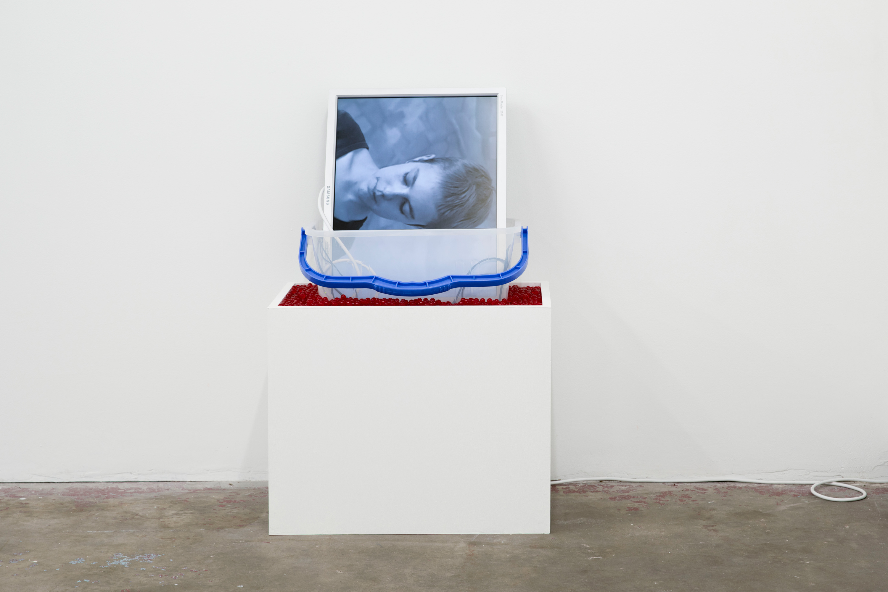 Deep Time (Media), 1996-2022, Medium Density Particleboard, Acrylic Paint, Water Beads, the bucket I use to collect water when my roof leaks, audio visual cables, 4:3 monitor, Brightsign, USB-powered speaker.