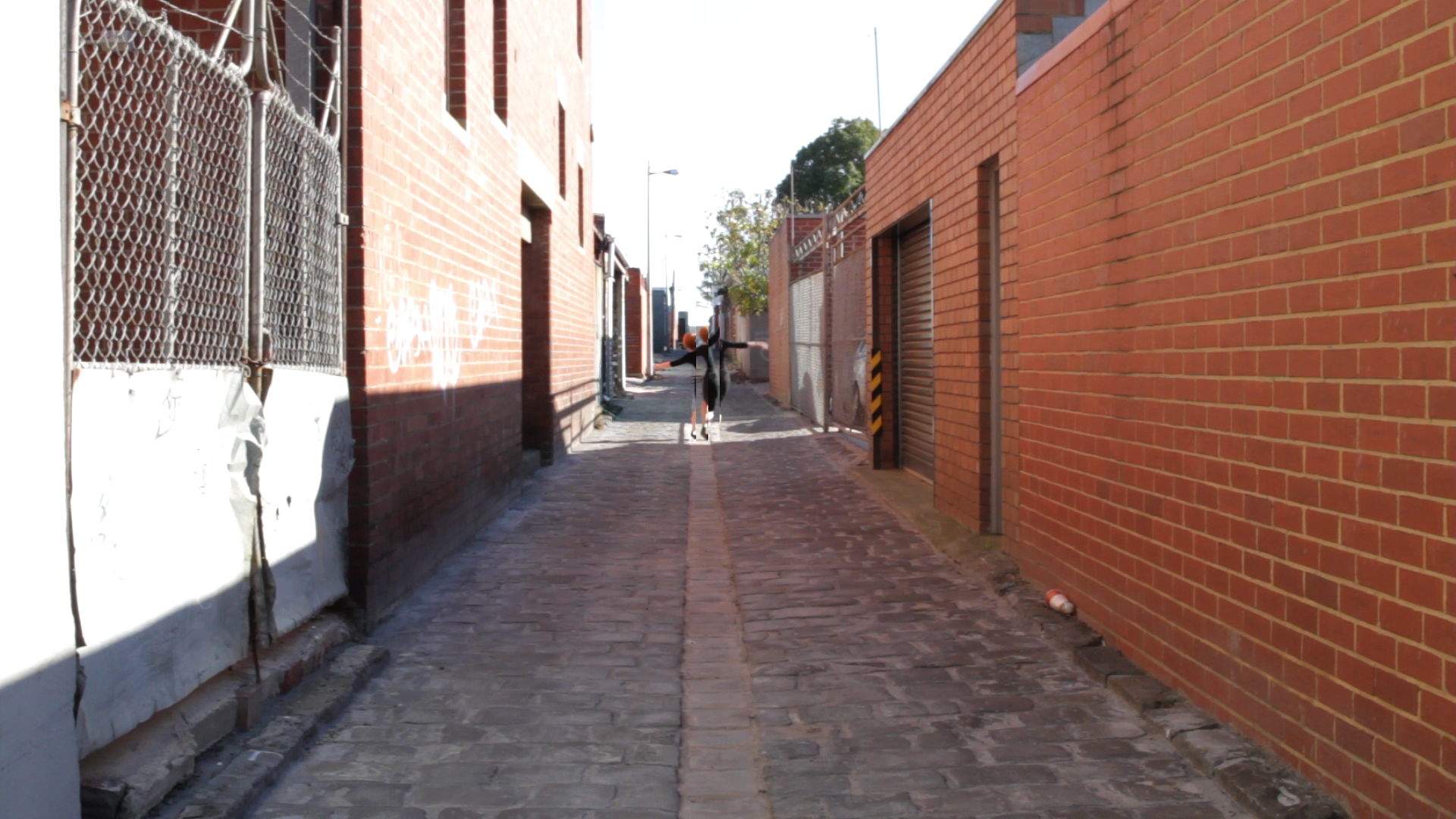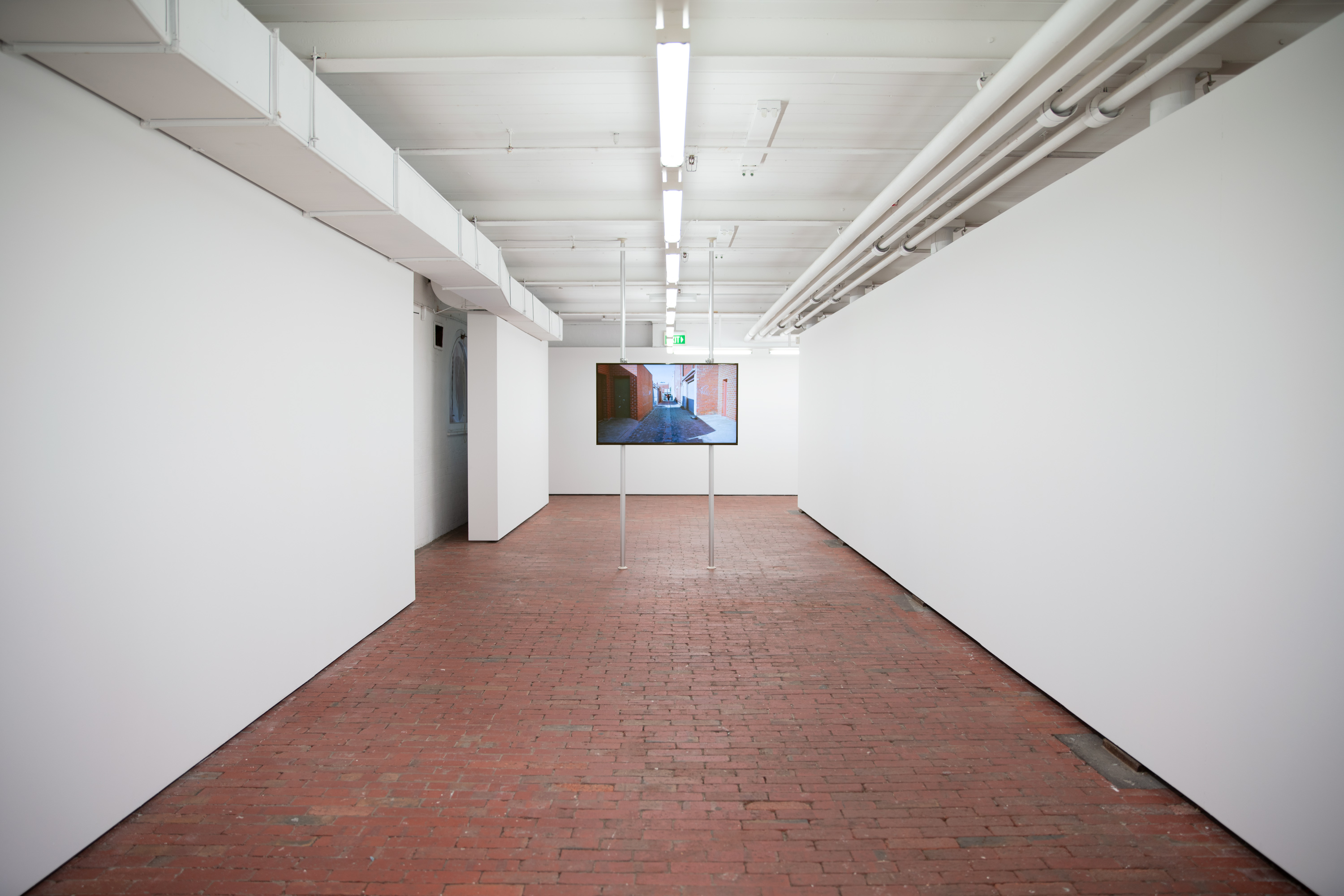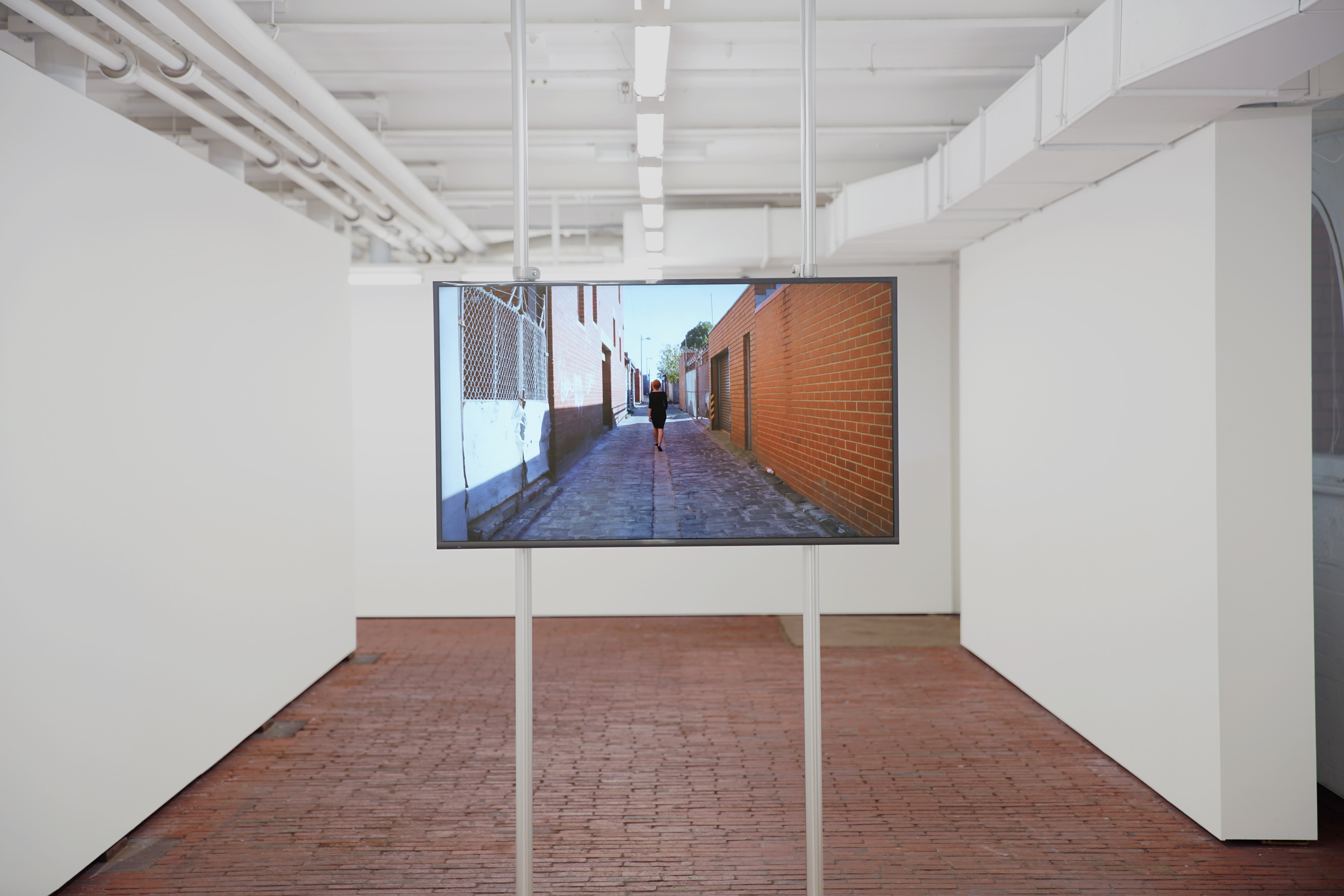 Two LCD screens sits back-to-back in a long corridor-shaped gallery with a red brick floor. Shot from opposite ends of a laneway, each channel depicts the same action from a fixed point that is replicated in the orientation of the monitors. The woman falls at the central point of the represented laneway and the monitors are placed in the centre of the gallery. The physical space of the gallery replicates the represented space of the laneway, extending the represented space beyond the frame into the physical environment.