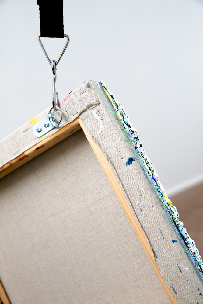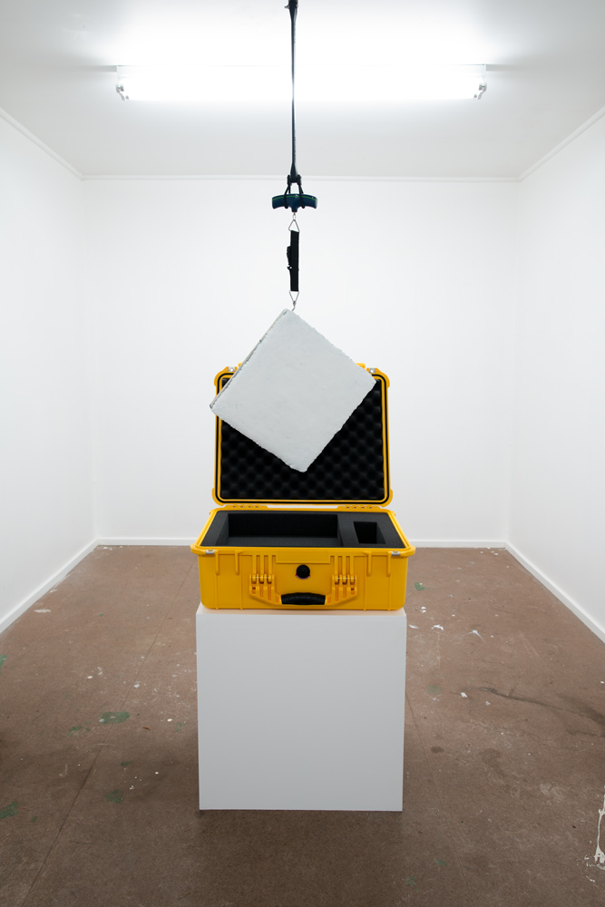 In the gallery, a painting hangs from a luggage scale. It is positioned directly above an open Pelican case that has been modified to accommodate the suspended objects. With the travel case sitting upon a plinth, the logistics of display and transport become a part of the work.