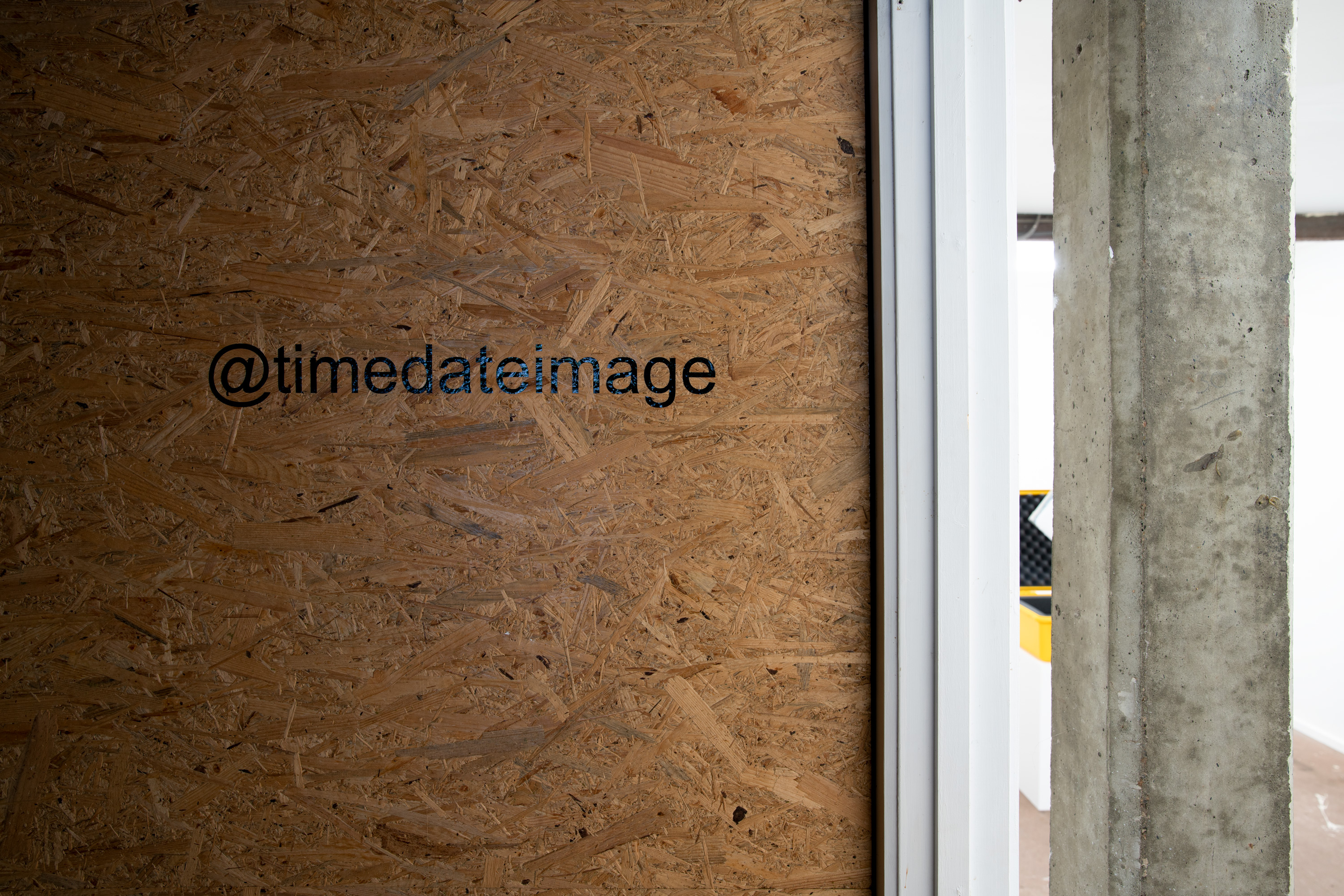 The monochrome painting is roughly coated in white paint. The trace of several layers of paint is visible at the side and back of the canvas. The layers of paint speak to the process of the painting’s construction. At the entrance of the gallery is black vinyl that reads: @timedateimage.