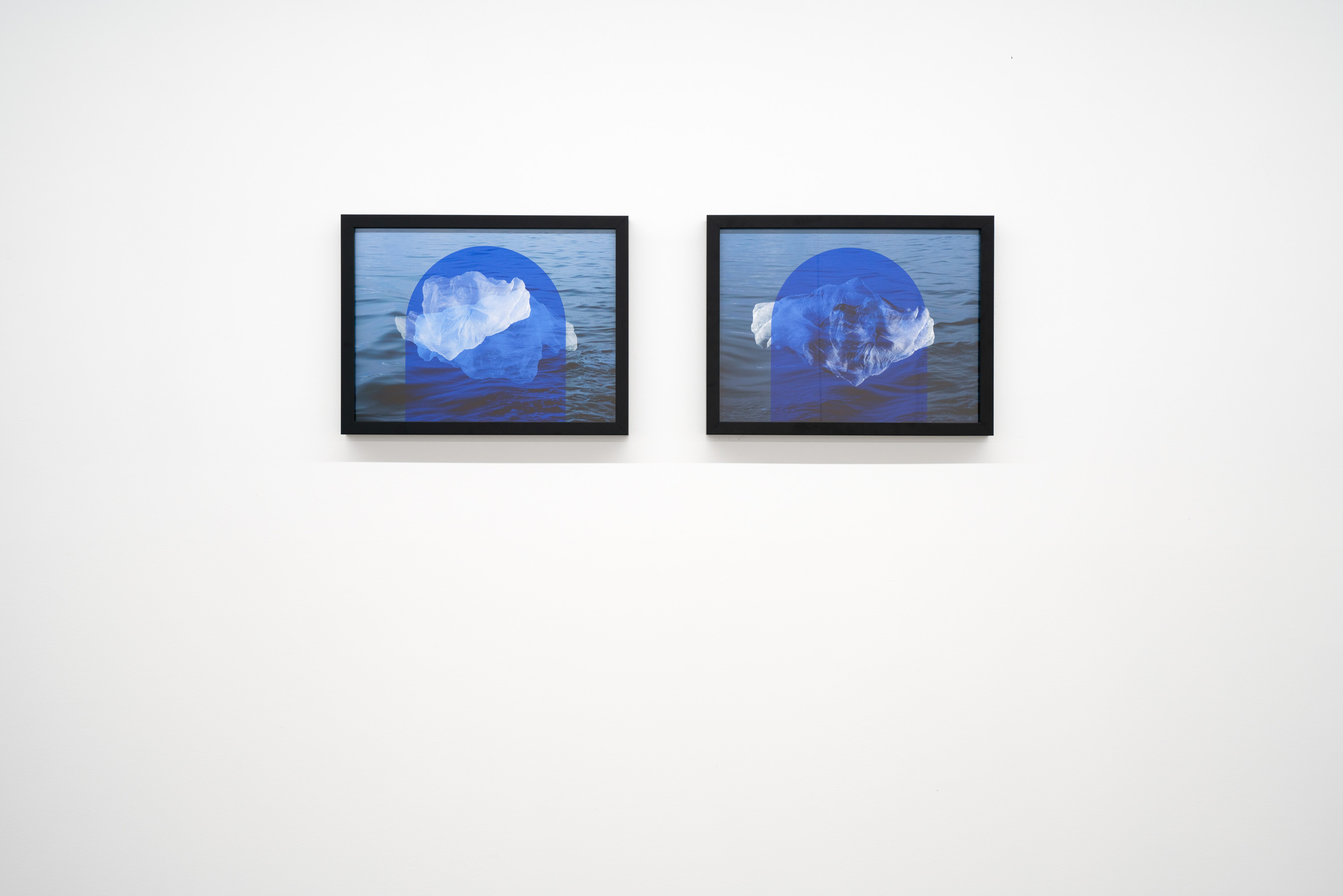 Leela Schauble, YInMn Ocean, Plastic Island #3-#4, 2021. Inkjet print on smooth pearl. 30cm x 40cm. Sediment. Installation View, Metro Arts, 2021.