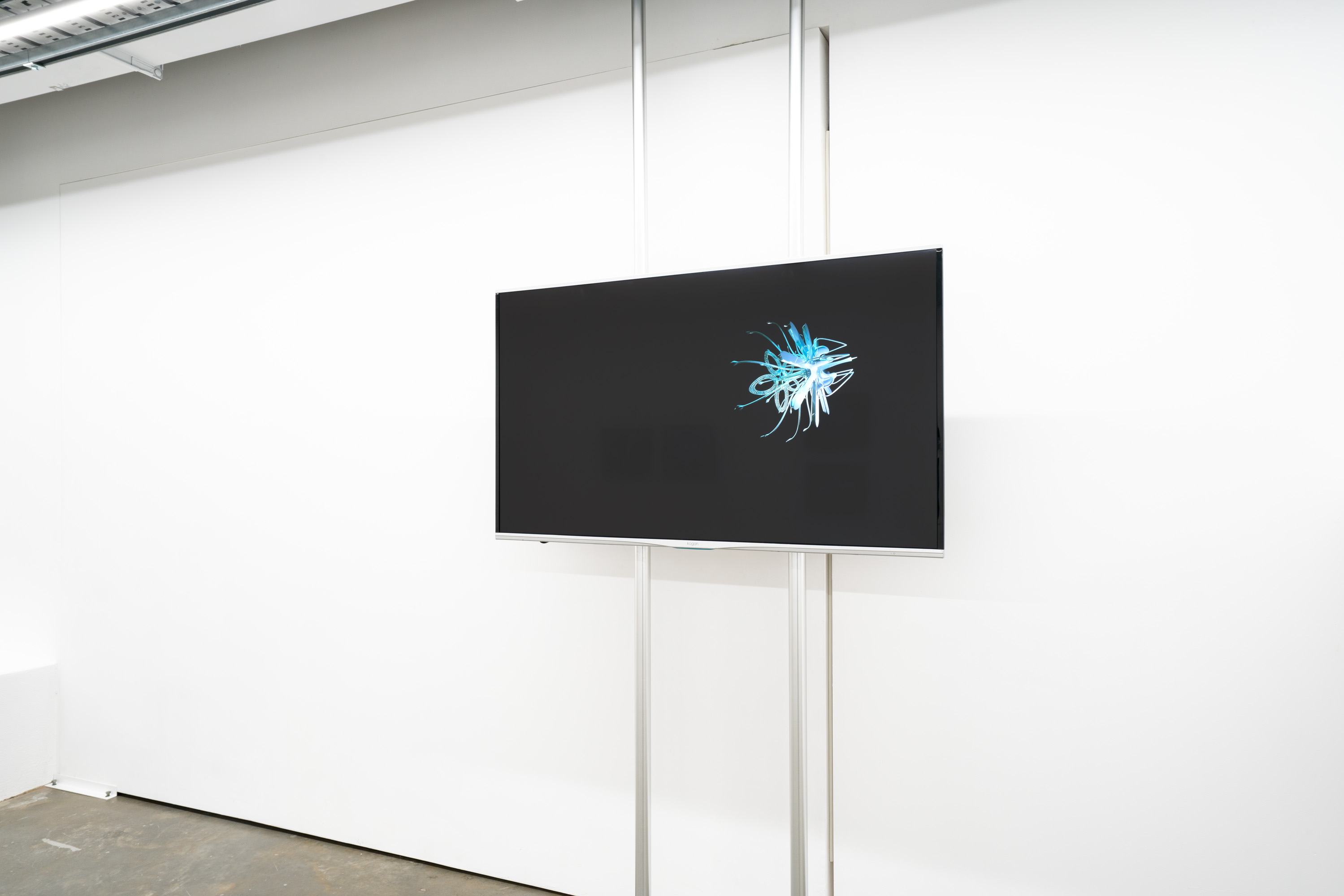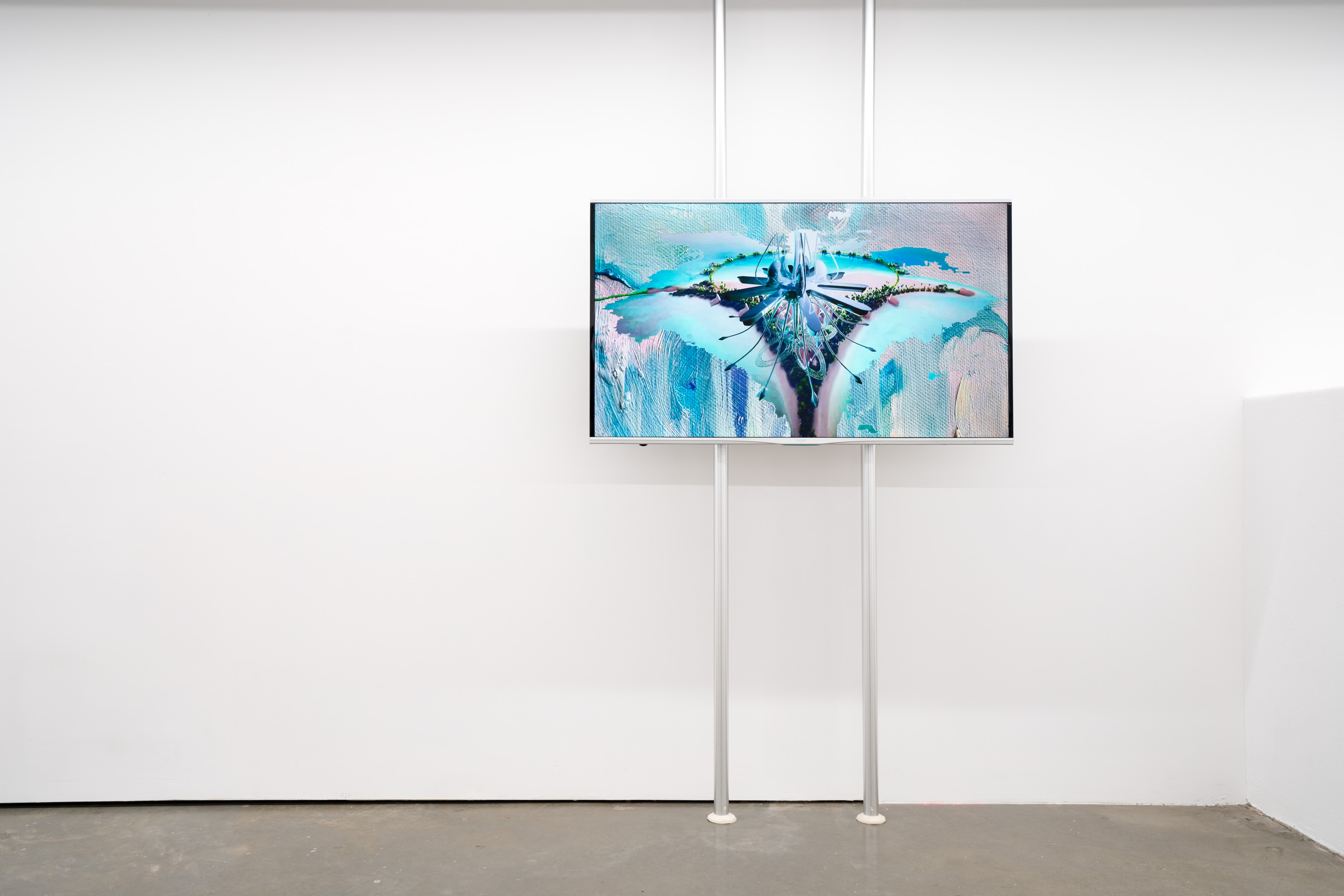 Sediment. Installation View, Metro Arts, 2021. Left to right: Leela Schauble, Synthetic Species Motion Study, 2012-2015. HD Video, 8min5sec. Samuel Tupou, Future Lands (Old World Rituals), 2017. Acrylic and serigraph on board. 86cm x 86cm. Courtesy the artist and Onespace Gallery.