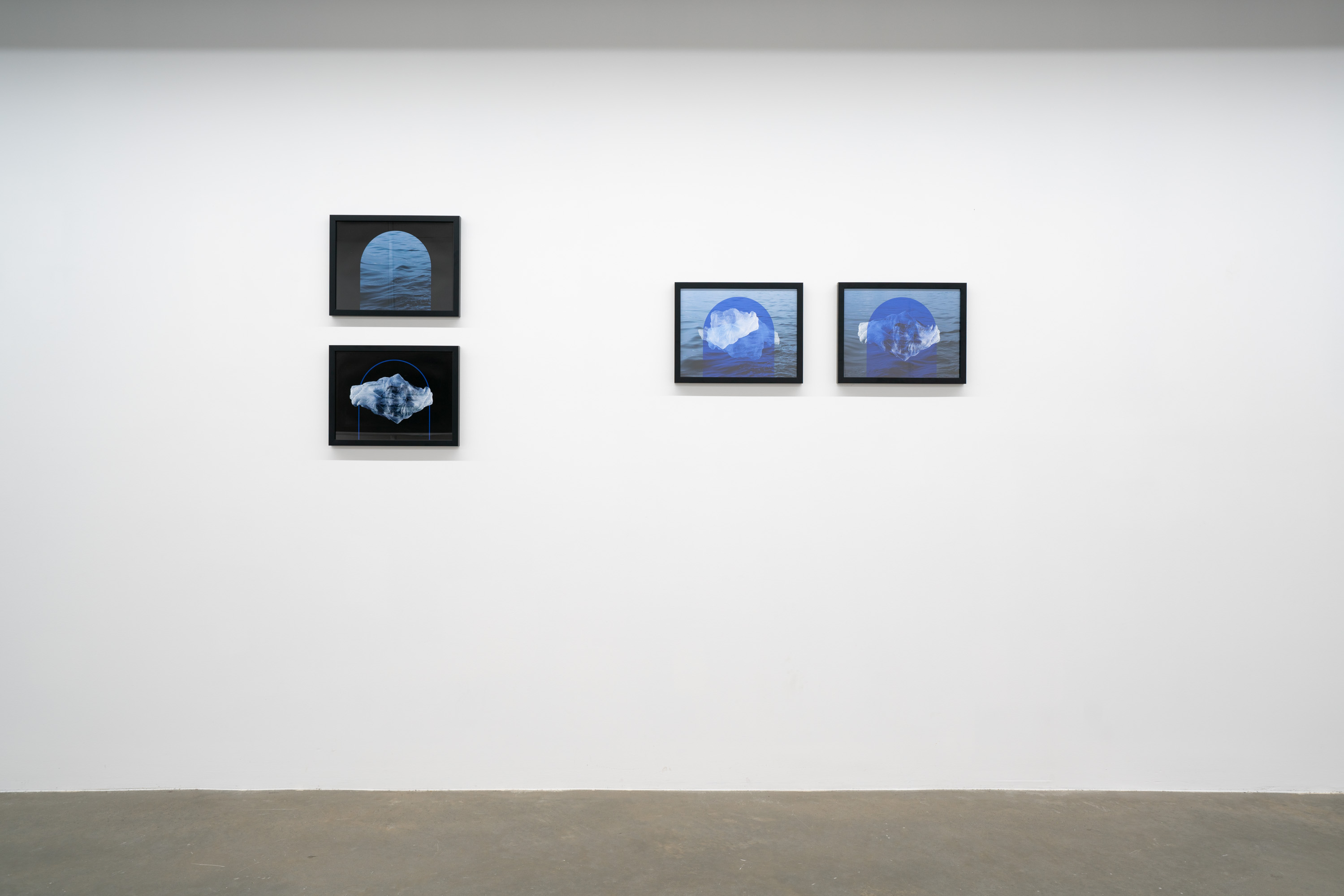 Leela Schauble, YInMn Ocean, Plastic Island #1-#4, 2021. Inkjet print on smooth pearl. 30cm x 40cm. Sediment. Installation View, Metro Arts, 2021.