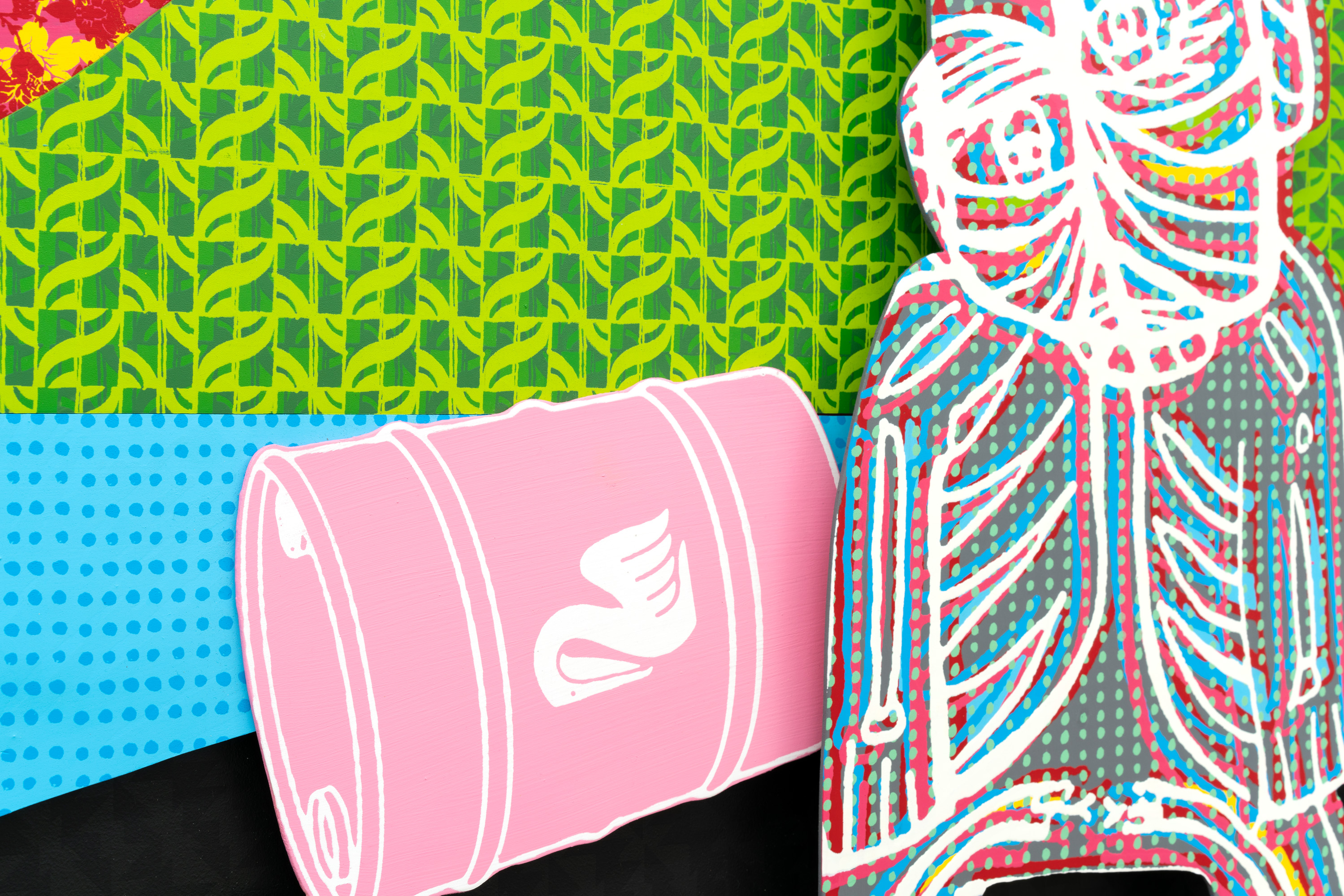 Samuel Tupou, Future Lands (Old World Rituals), 2017. Acrylic and serigraph on board. 86cm x 86cm. Courtesy the artist and Onespace Gallery. Sediment. Installation View, Metro Arts, 2021. Detail.