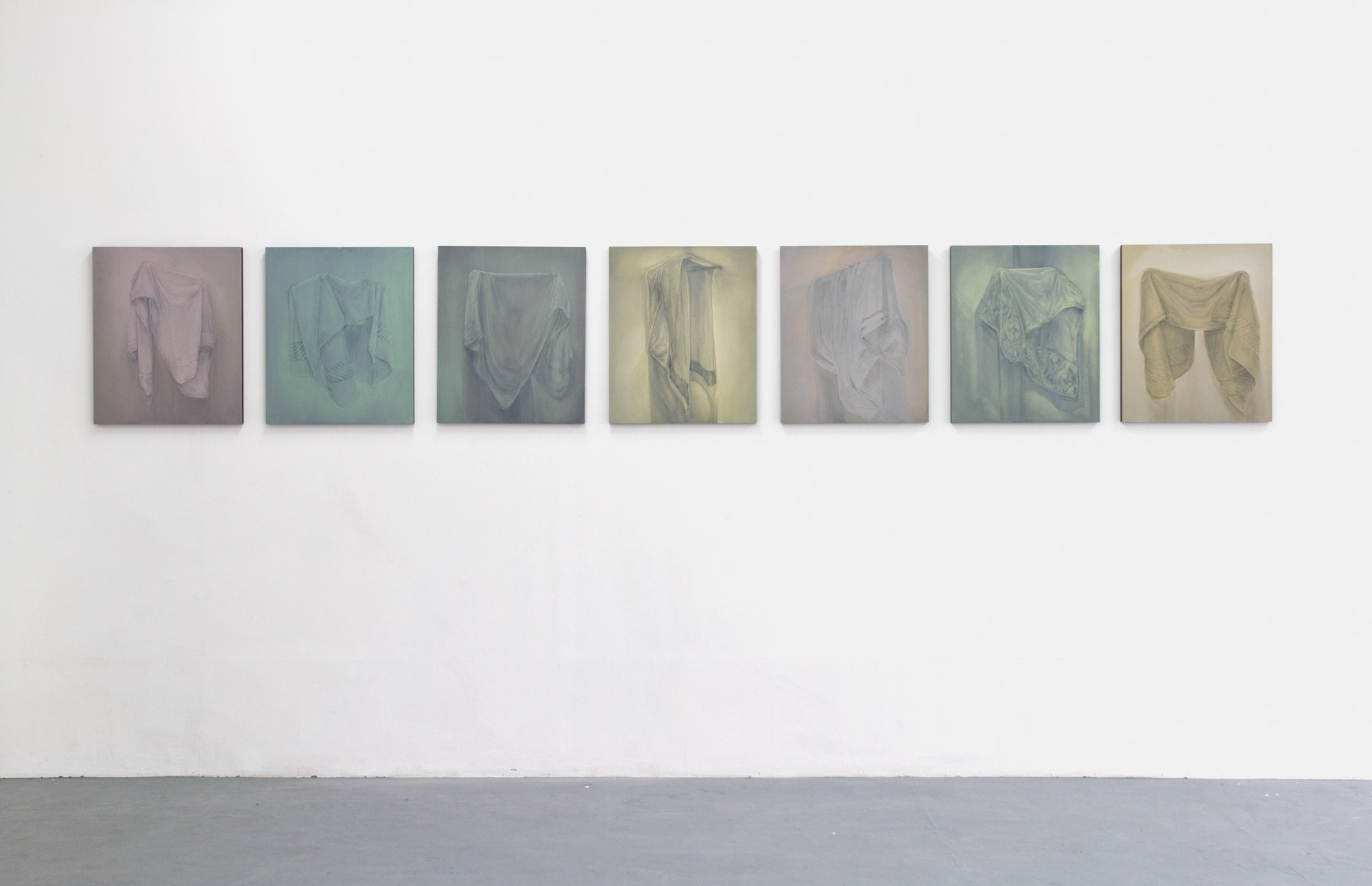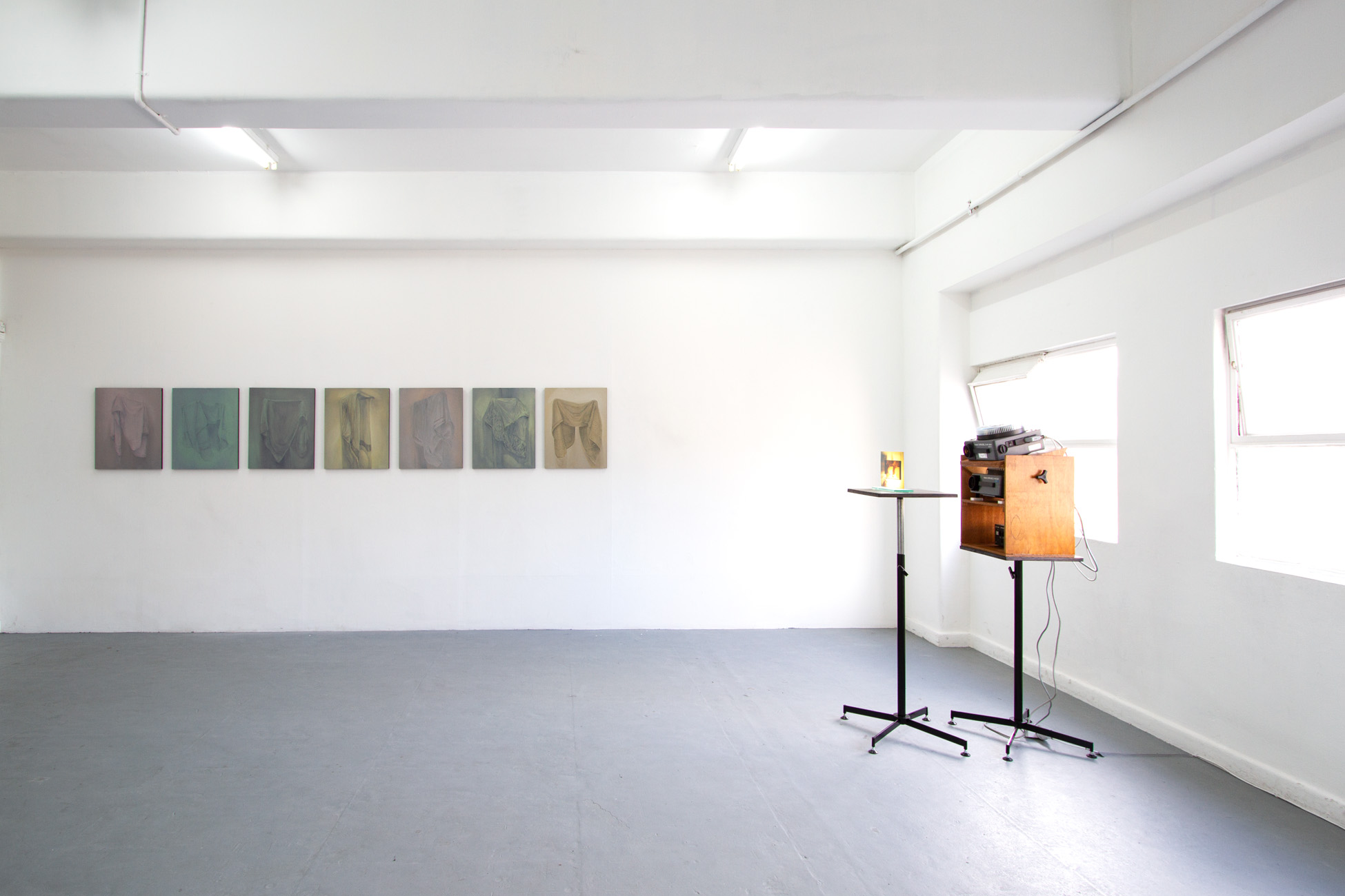 Karla Marchesi, Montag, Mittwoch, Donnerstag, Deinstag, Freitag, Samstag, Sontag, 2013, Oil on Board, 50x60cm. Installation View, Wandering Archive. Blindside, 2015.