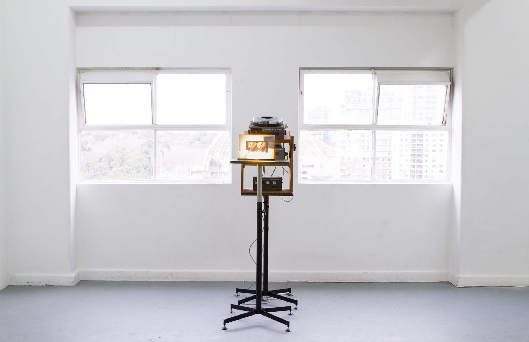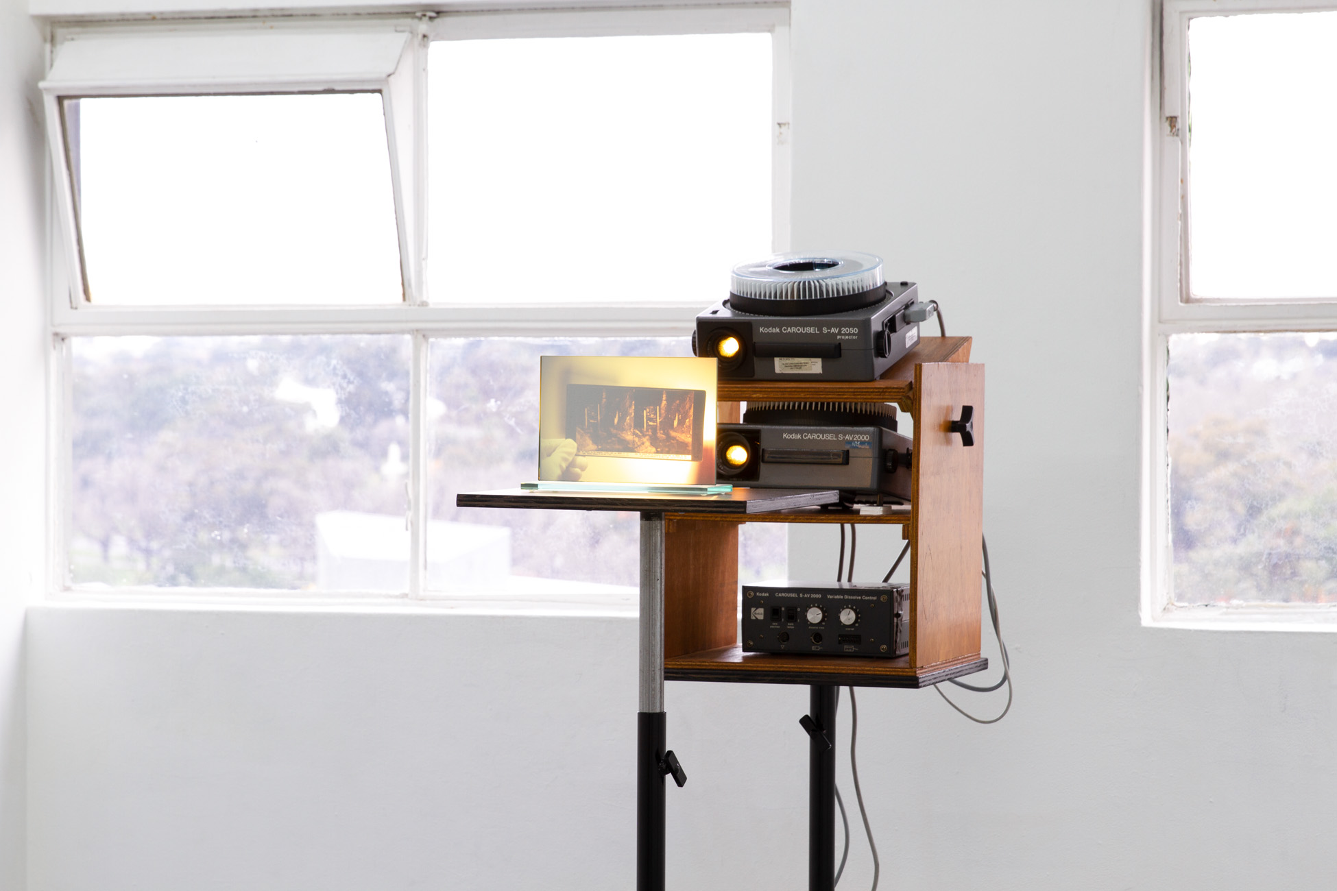 Jessica Hood, The Cave and the Archive: Elery Hamilton-Smith’s stereograph collection, 2015. One-hundred and sixty-two 35mm colour transparencies, two Kodak Carousel projectors, ceramic coated glass, projector stands. Installation View, Wandering Archive, Blindside, 2015.