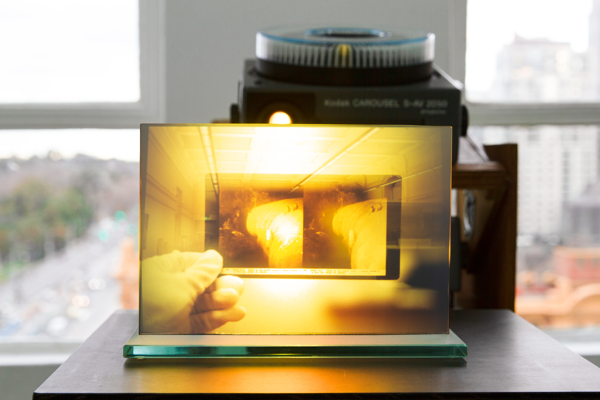 Jessica Hood, The Cave and the Archive: Elery Hamilton-Smith’s stereograph collection, 2015. One-hundred and sixty-two 35mm colour transparencies, two Kodak Carousel projectors, ceramic coated glass, projector stands. Detail. Installation View, Wandering Archive, Blindside, 2015.