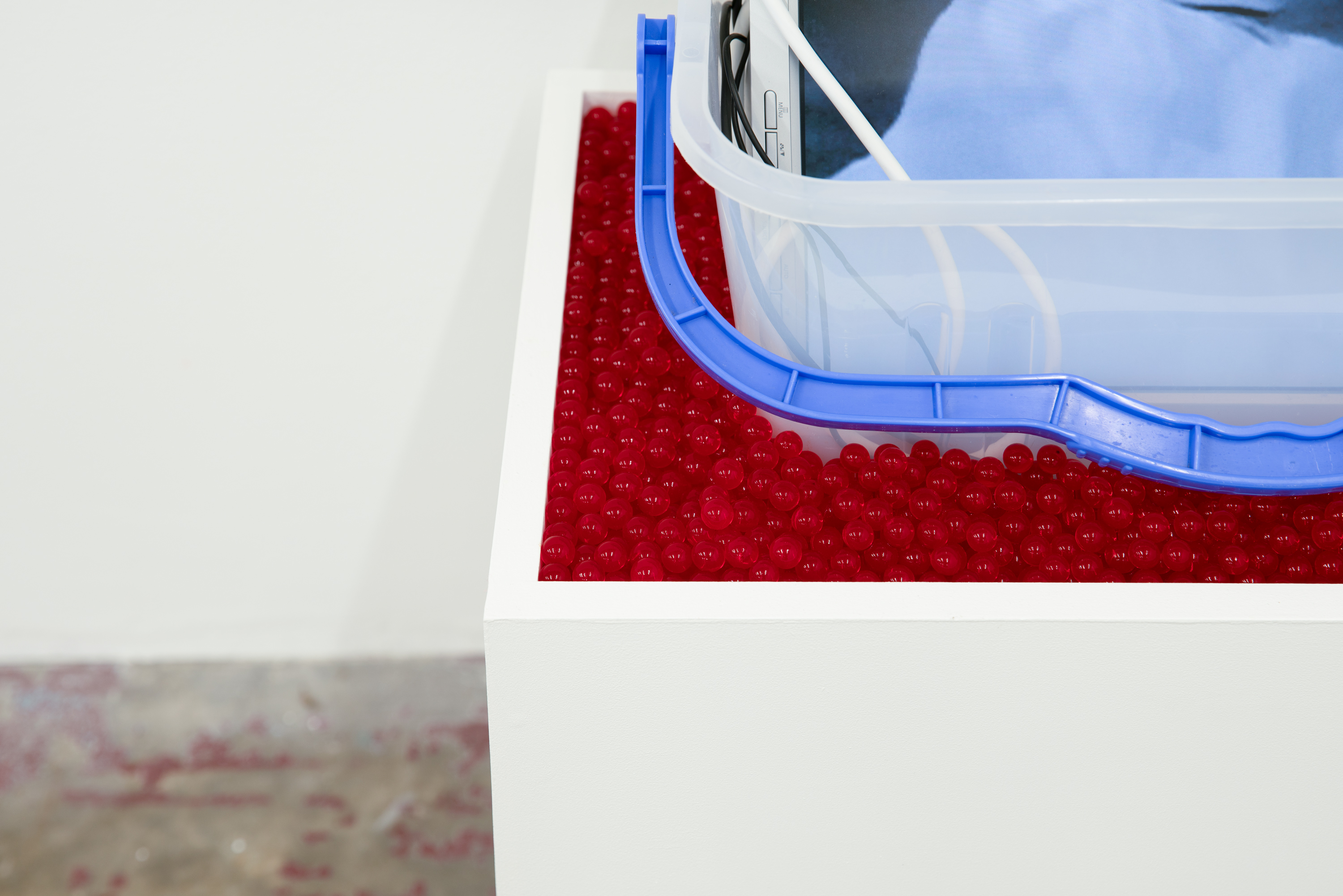 Deep Time (Media), 1996-2022, Medium Density Particleboard, Acrylic Paint, Water Beads, the bucket I use to collect water when my roof leaks, audio visual cables, 4:3 monitor, Brightsign, USB-powered speaker.