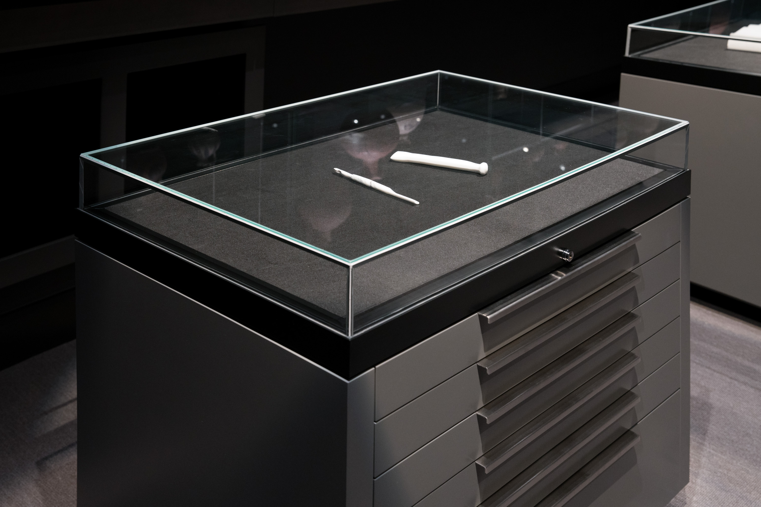 Elysse De Valle, Carrara Marble Chisel and Writing Pen, 2015, Carrara Marble. Installation View. Excavation, 2017. Object Based Learning Lab, Arts West, University of Melbourne. Nite Art 2017