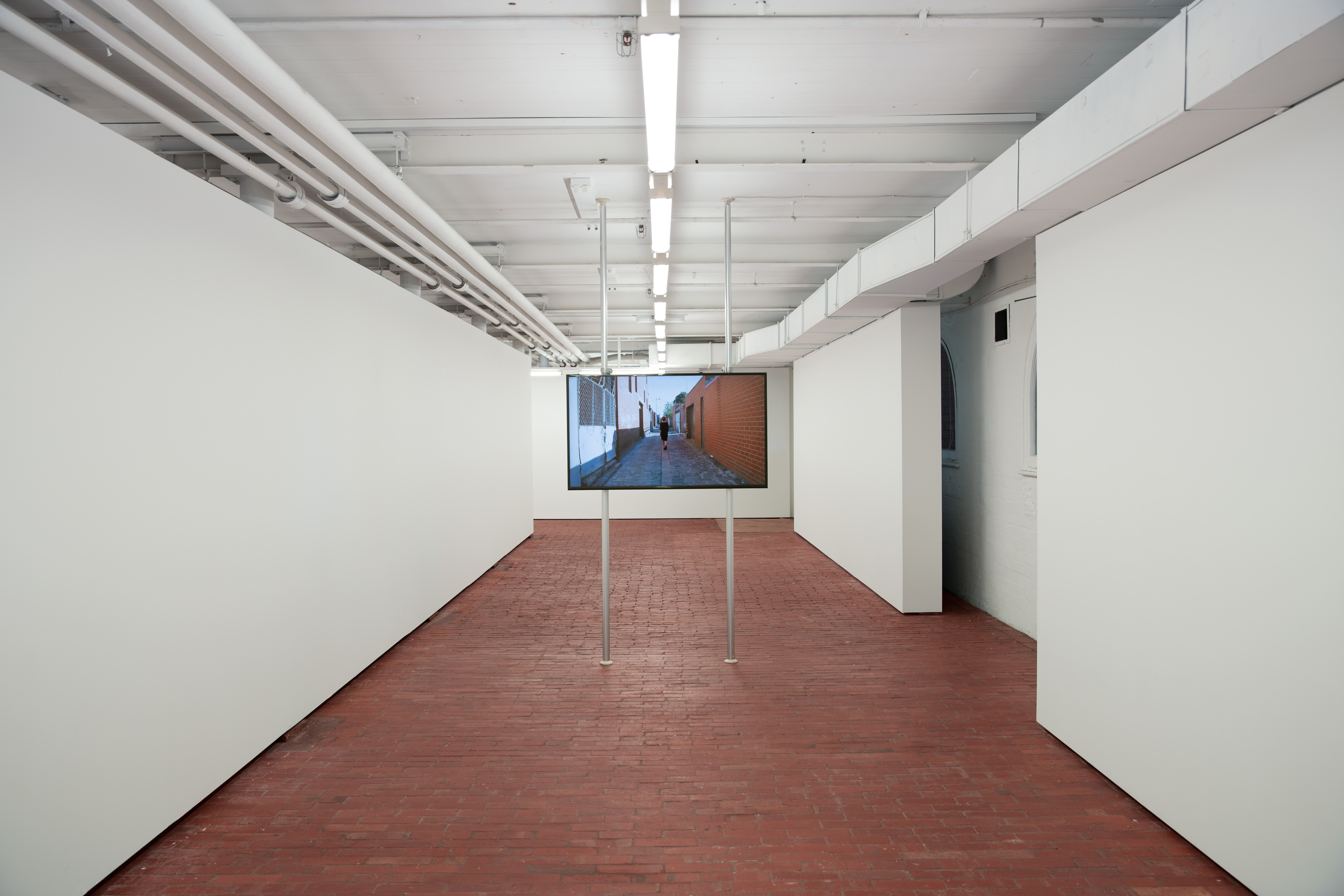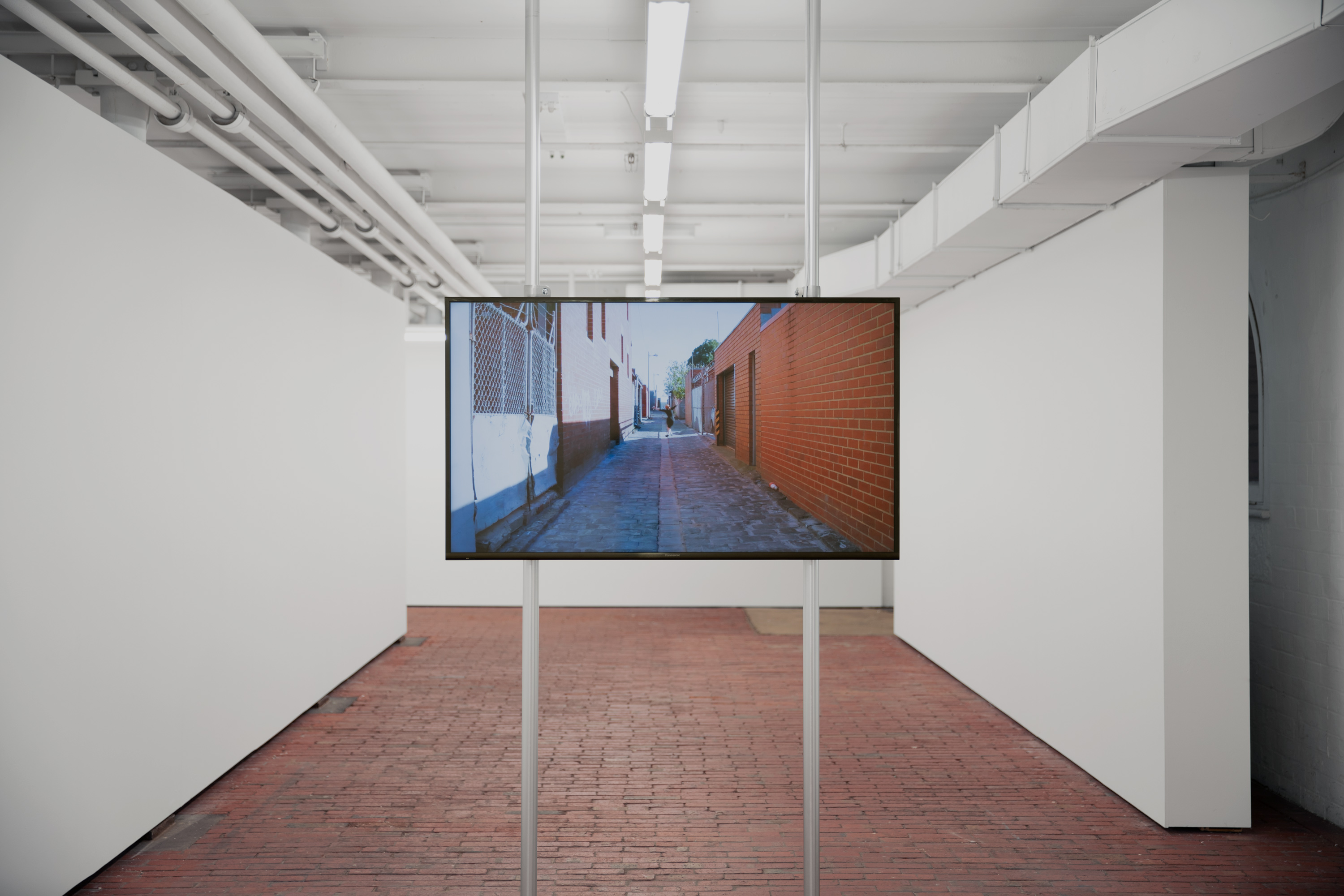 Two LCD screens sits back-to-back in a long corridor-shaped gallery with a red brick floor. Shot from opposite ends of a laneway, each channel depicts the same action from a fixed point that is replicated in the orientation of the monitors. The woman falls at the central point of the represented laneway and the monitors are placed in the centre of the gallery. The physical space of the gallery replicates the represented space of the laneway, extending the represented space beyond the frame into the physical environment.