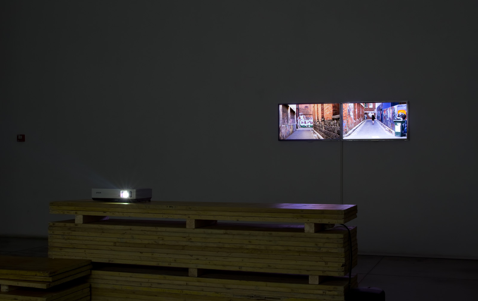 Simone Hine, 11:35am, 2009, 2 Channel HD Video, 2mins1sec, loop. Installation View.Moving Pictures / Expanding Space, Careof, Milan, 2014.
