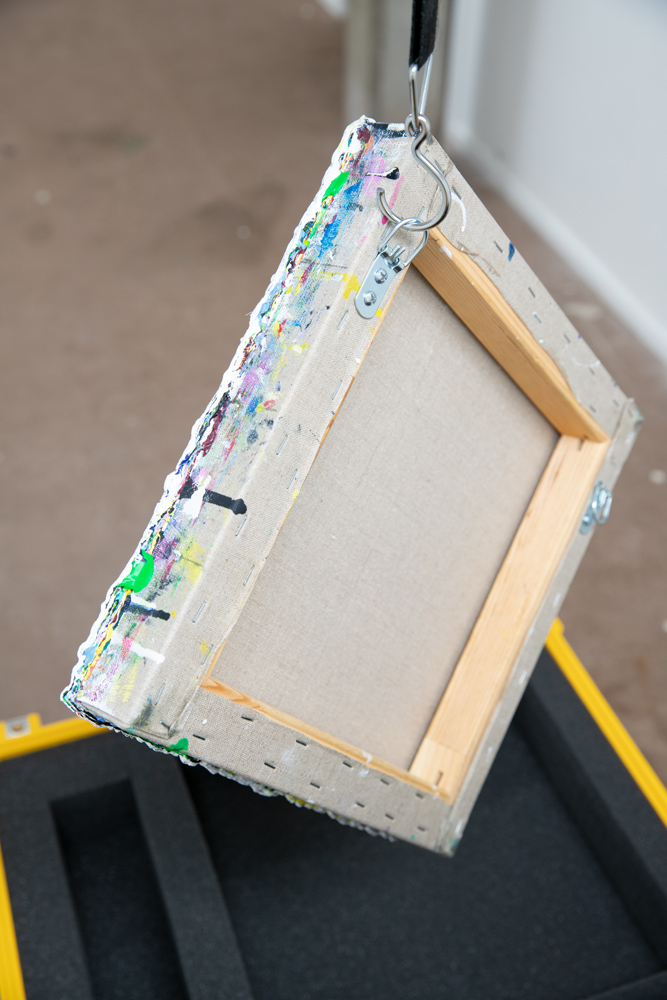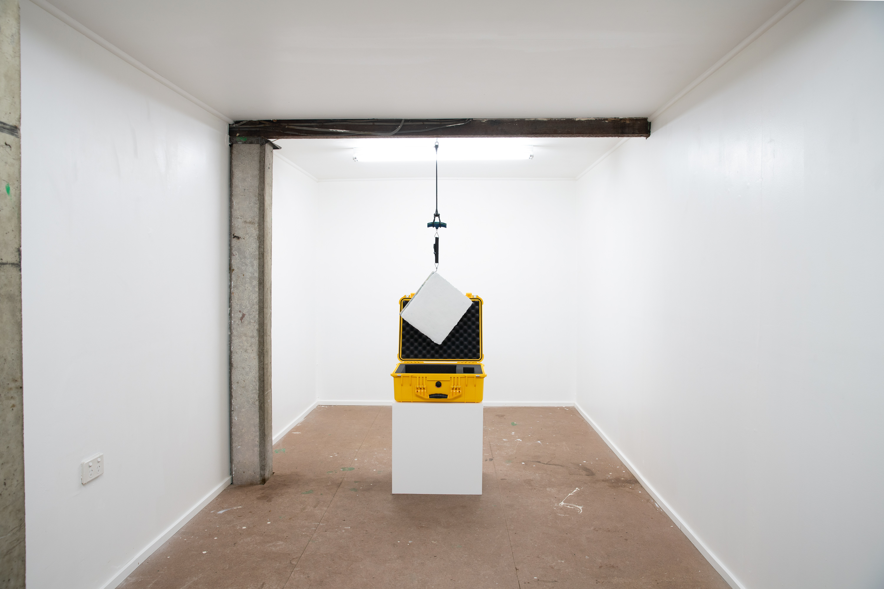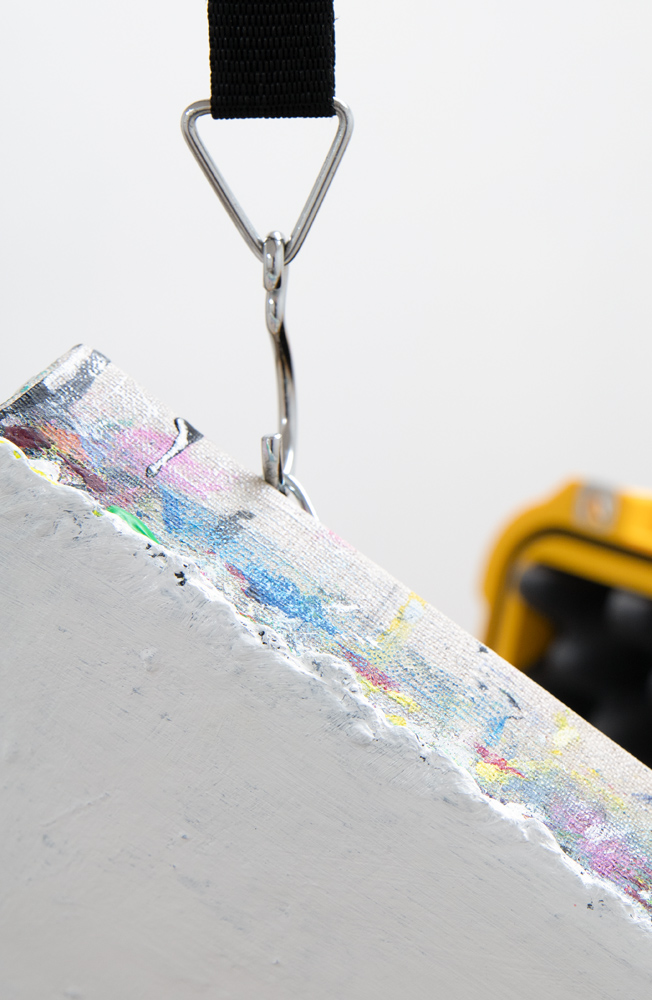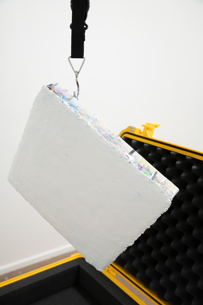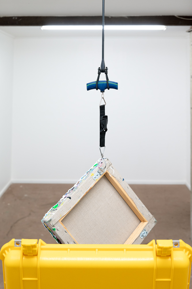 In the gallery, a painting hangs from a luggage scale. It is positioned directly above an open Pelican case that has been modified to accommodate the suspended objects. With the travel case sitting upon a plinth, the logistics of display and transport become a part of the work.