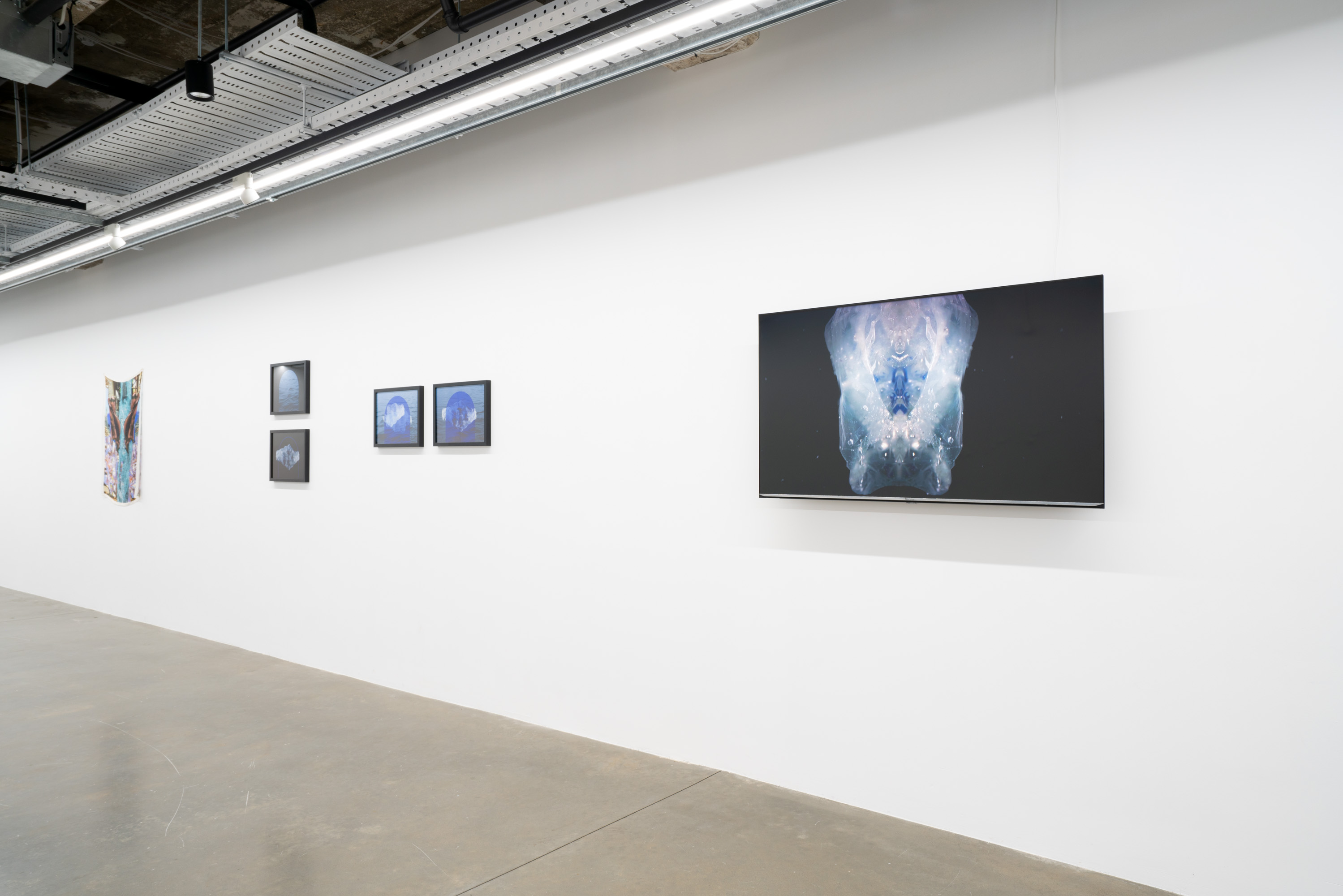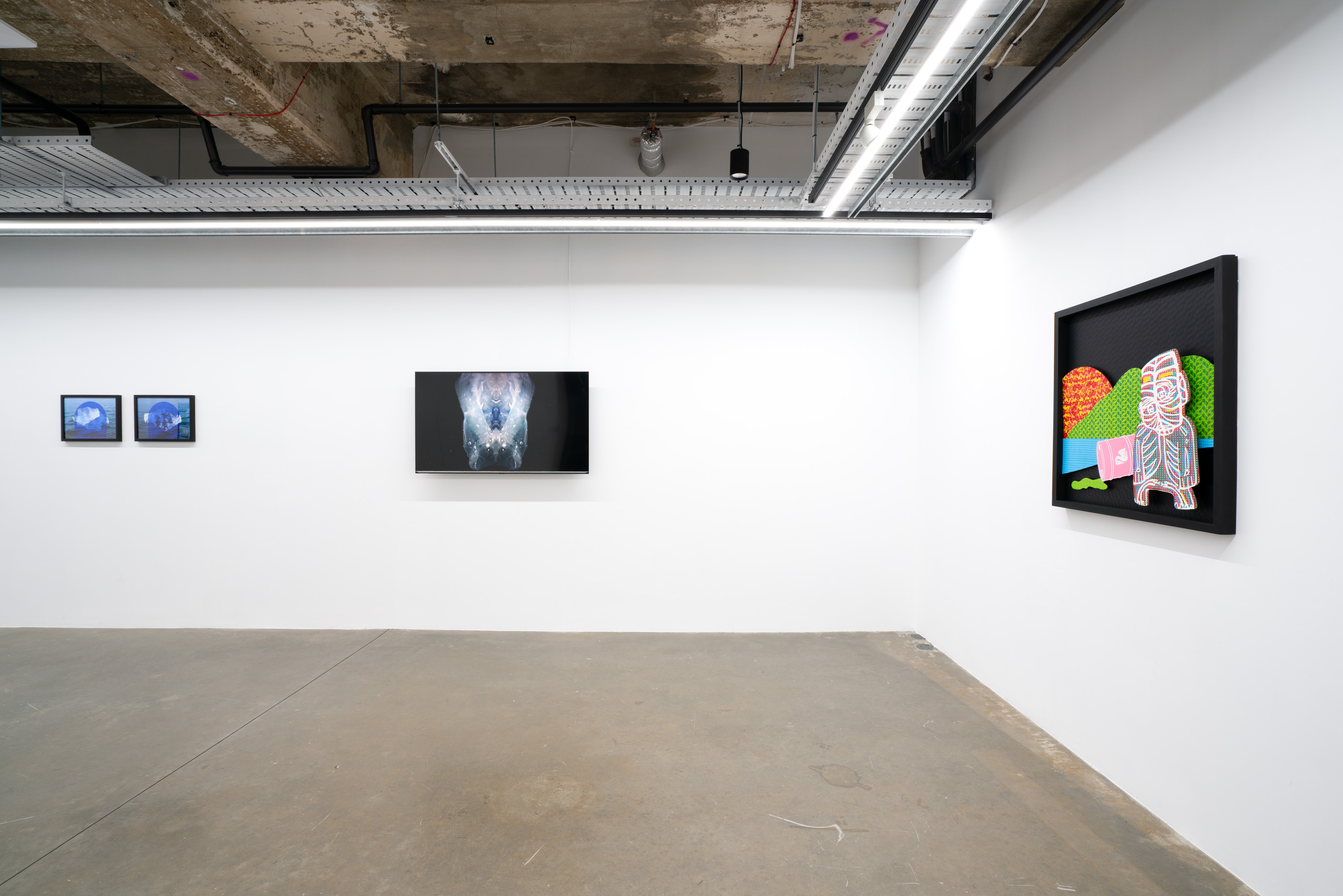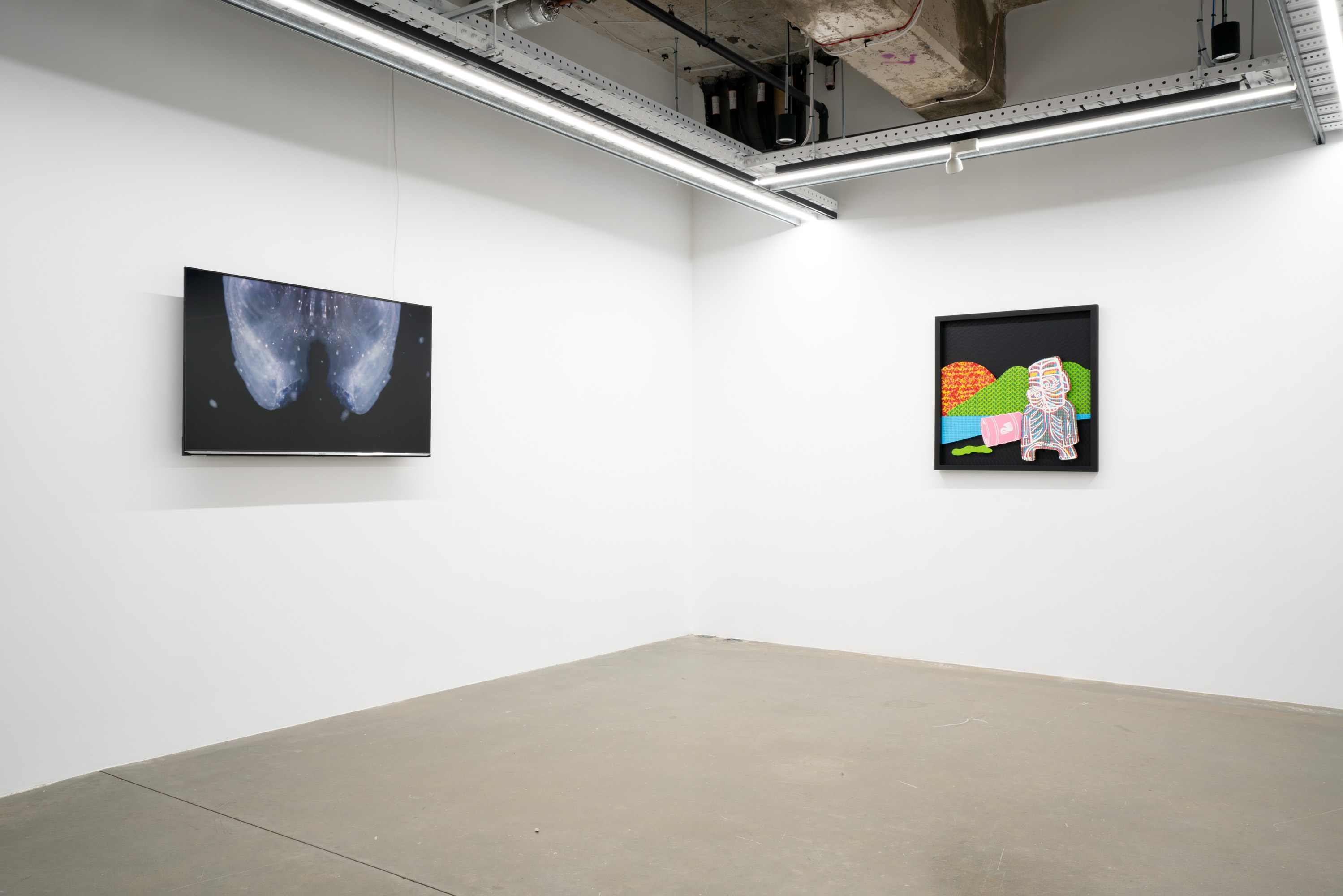 Sediment. Installation View, Metro Arts, 2021. Left to right: Leela Schauble, Synthetic Species Motion Study, 2012-2015. HD Video, 8min5sec. Samuel Tupou, Future Lands (Old World Rituals), 2017. Acrylic and serigraph on board. 86cm x 86cm. Courtesy the artist and Onespace Gallery.