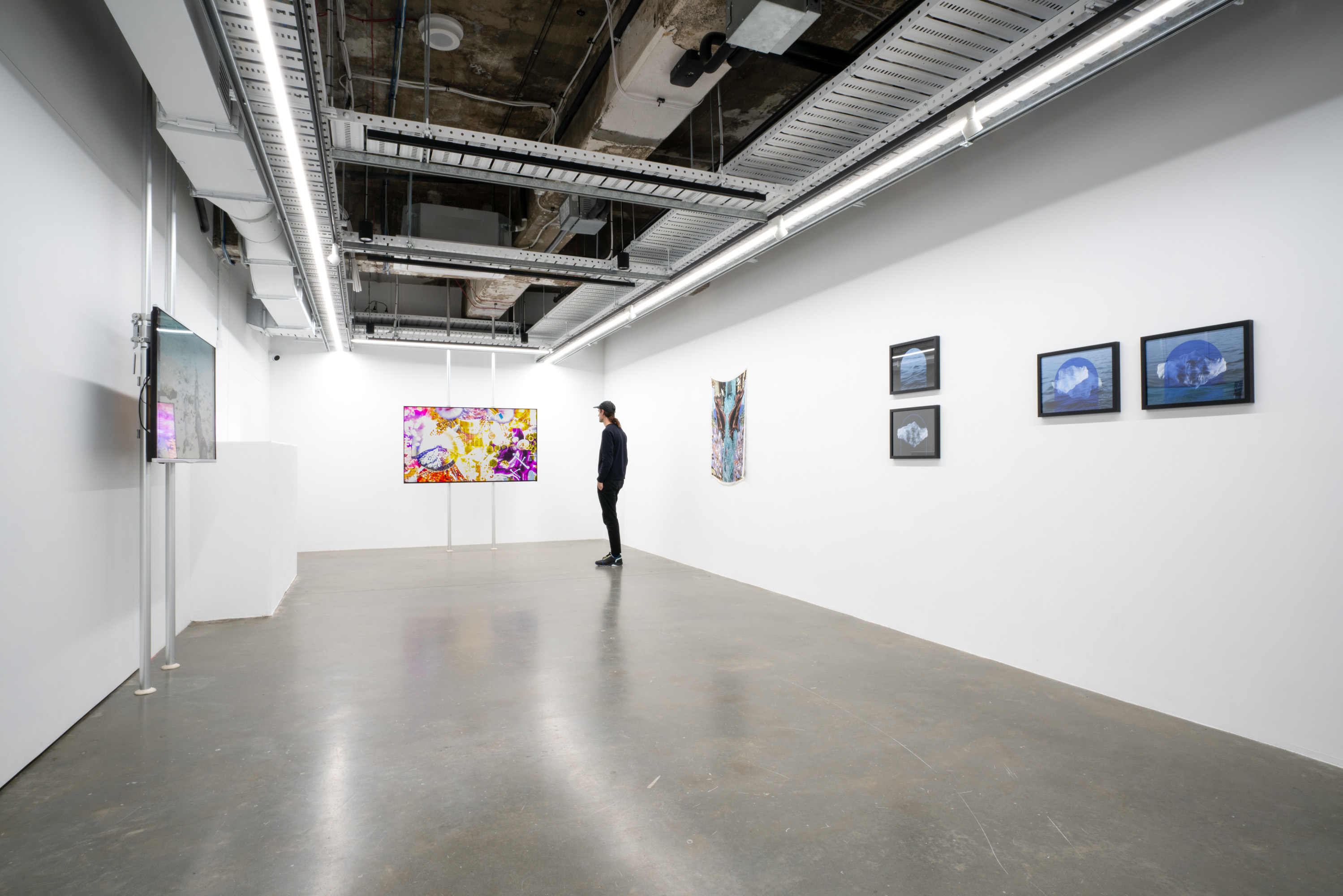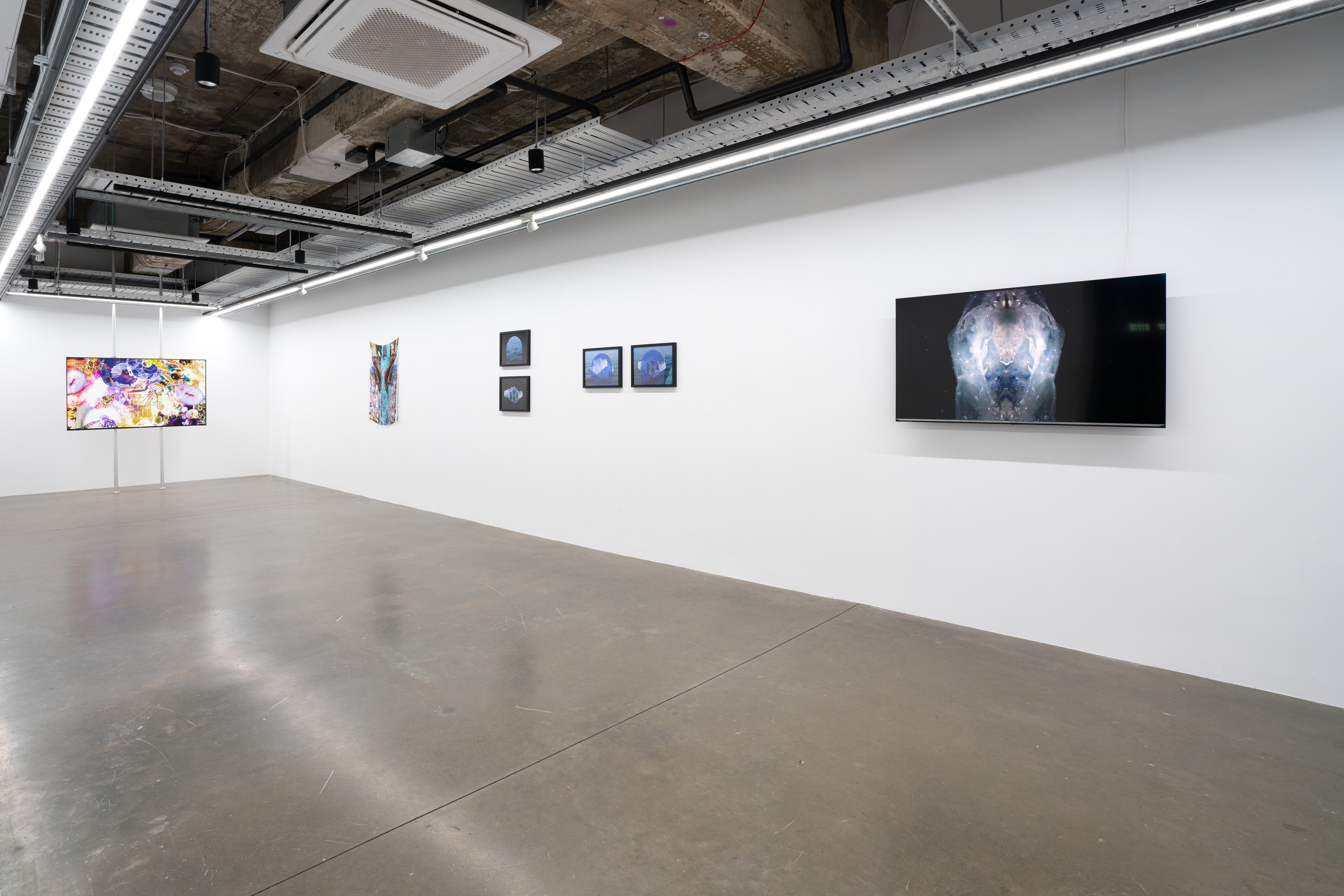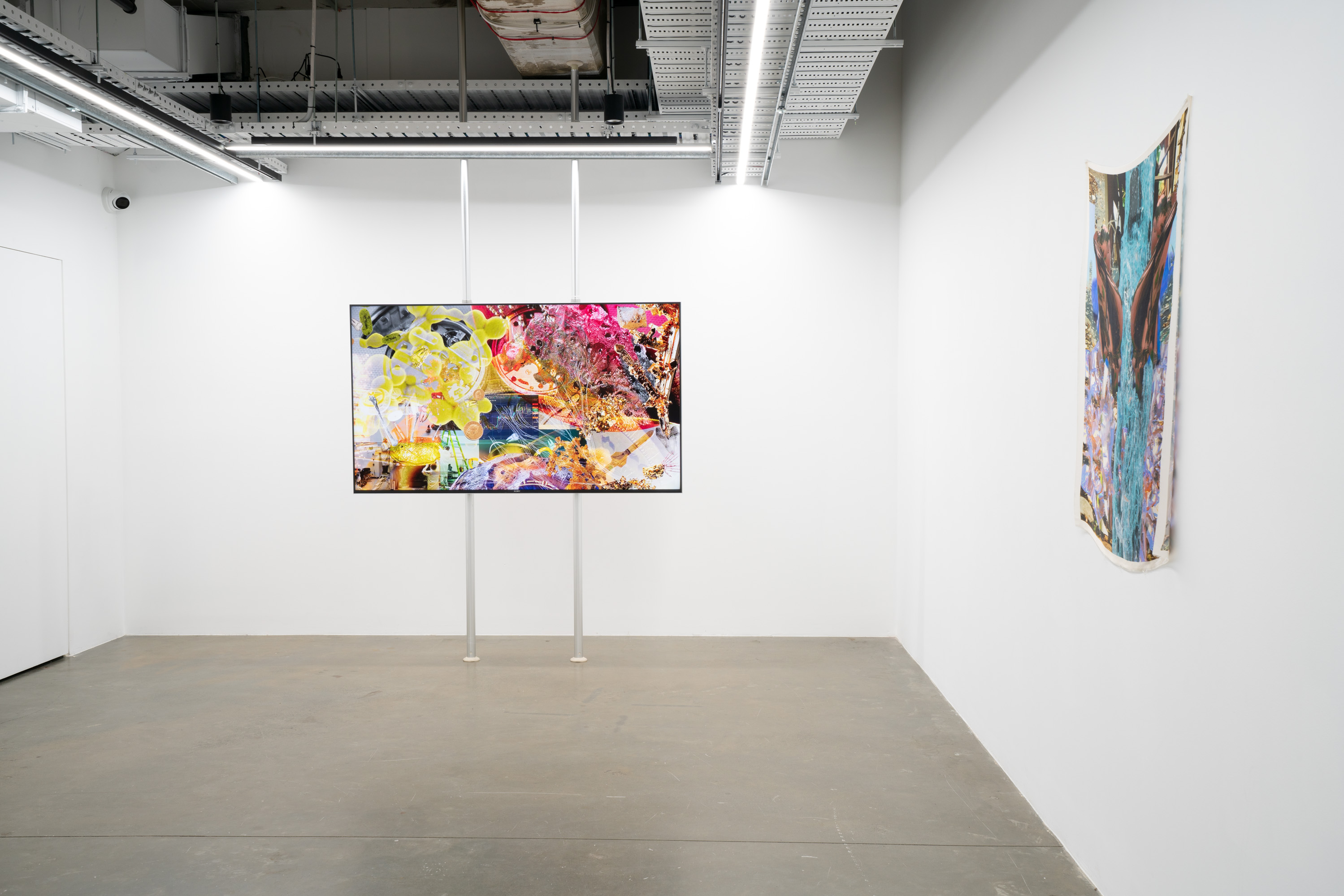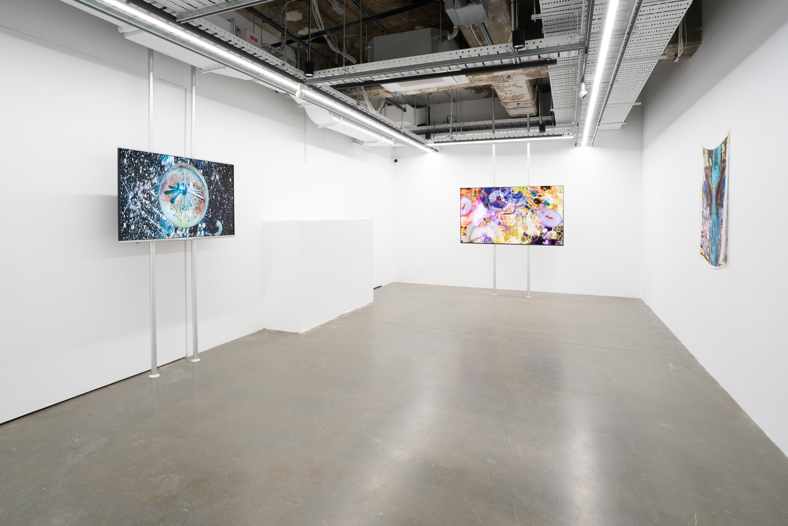 Sediment. Installation View, Metro Arts, 2021. Left to right: Leela Schauble, Synthetic Species Motion Study, 2012-2015. HD Video, 8min5sec. Samuel Tupou, Future Lands (Old World Rituals), 2017. Acrylic and serigraph on board. 86cm x 86cm. Courtesy the artist and Onespace Gallery.