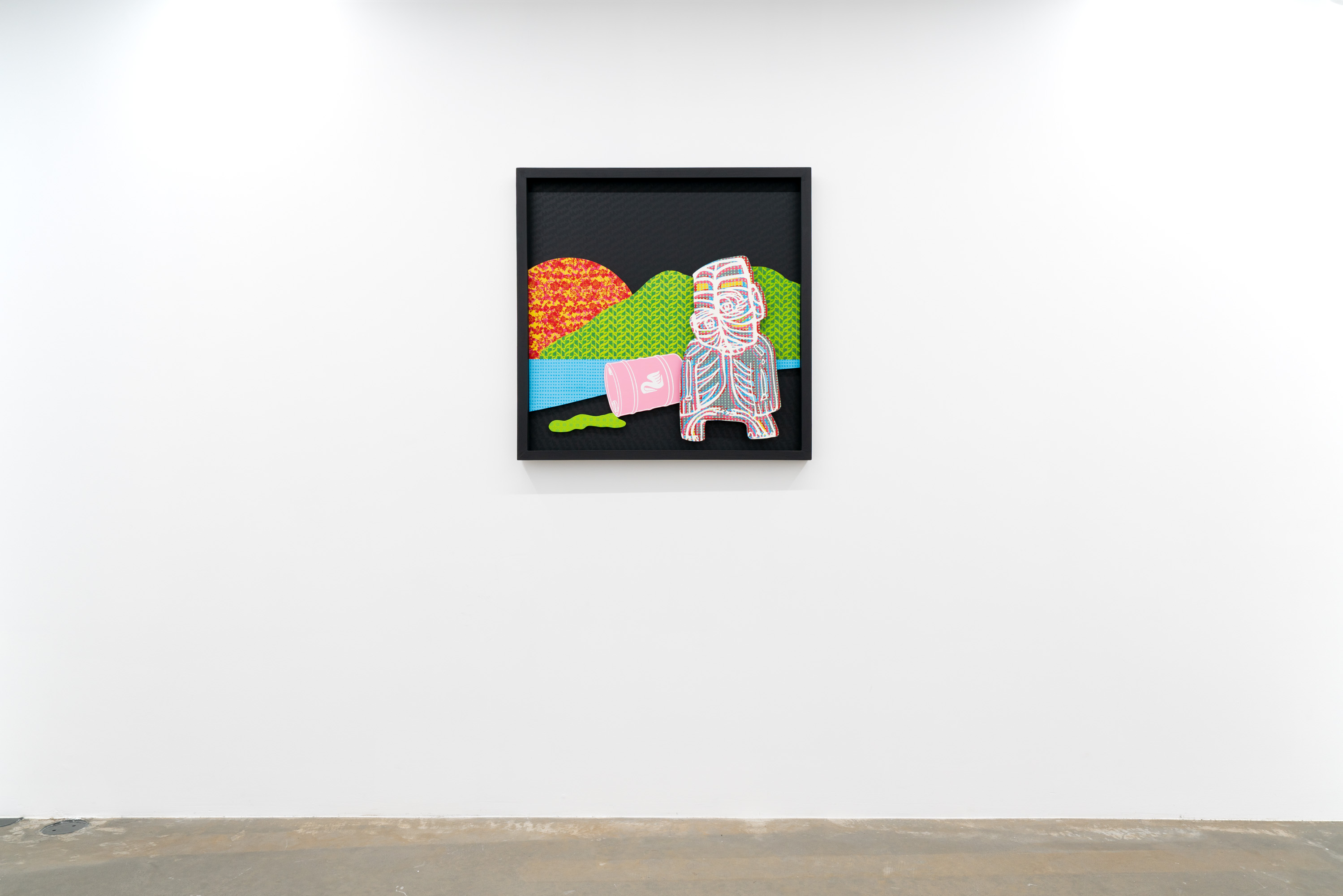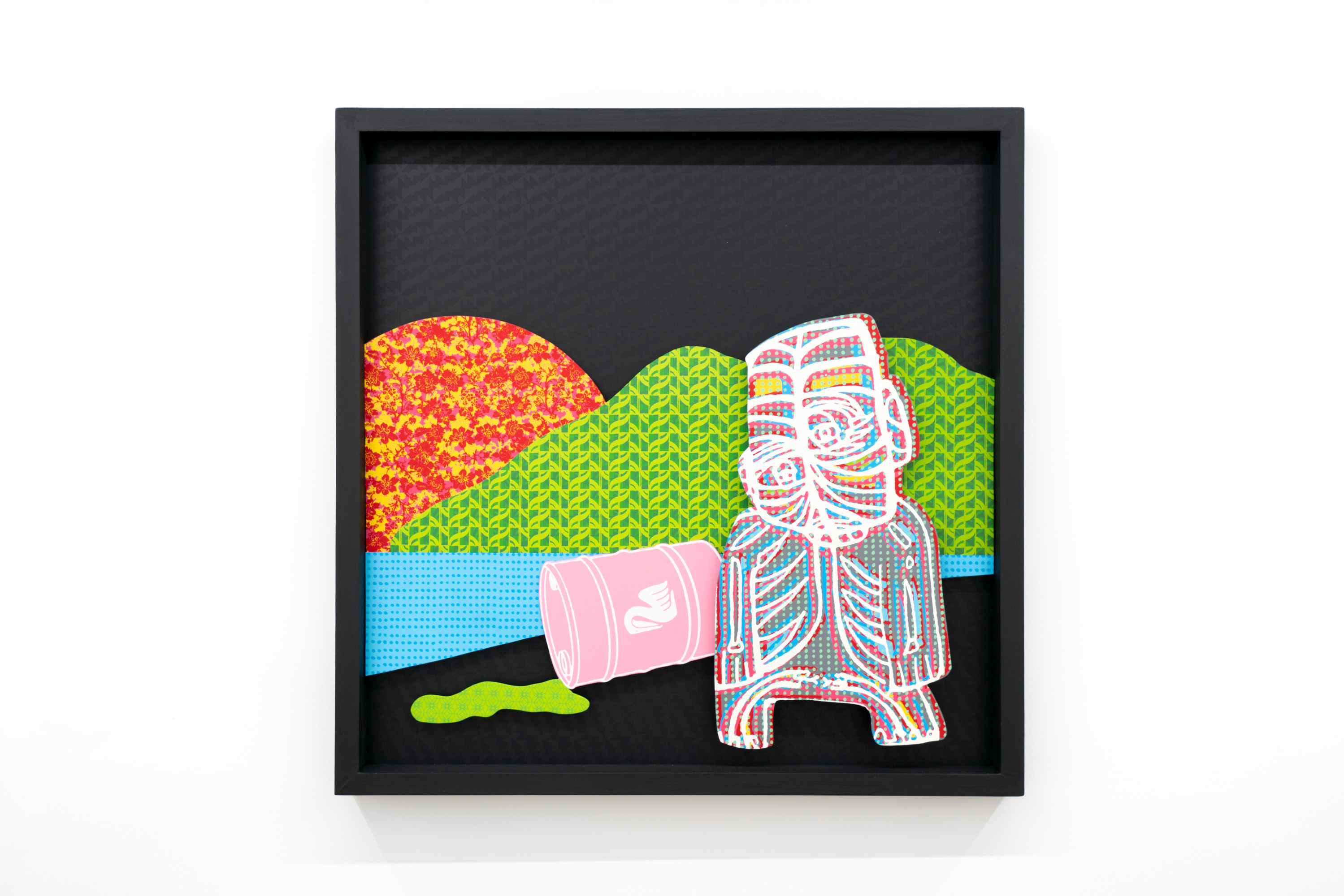 Samuel Tupou, Future Lands (Old World Rituals), 2017. Acrylic and serigraph on board. 86cm x 86cm. Courtesy the artist and Onespace Gallery. Sediment. Installation View, Metro Arts, 2021. Detail.