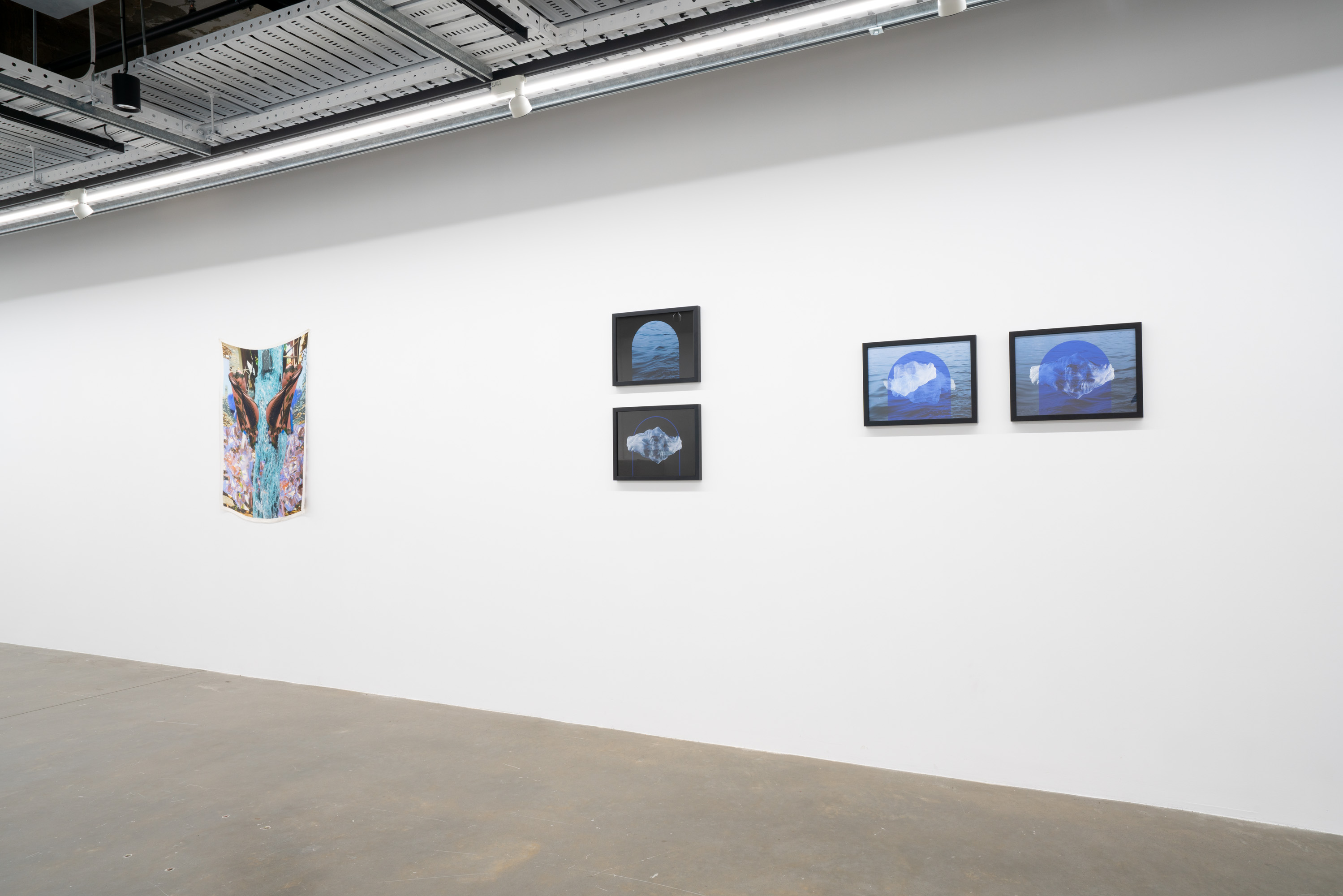Left to Right: Marian Tubbs, my internet and ocean twin, 2017. Pigment print on silk, 100 x 75 cm. Courtesy the artist and STATION. Leela Schauble, YInMn Ocean, Plastic Island #1-#4, 2021. Inkjet print on smooth pearl. 30cm x 40cm. Sediment. Installation View, Metro Arts, 2021.