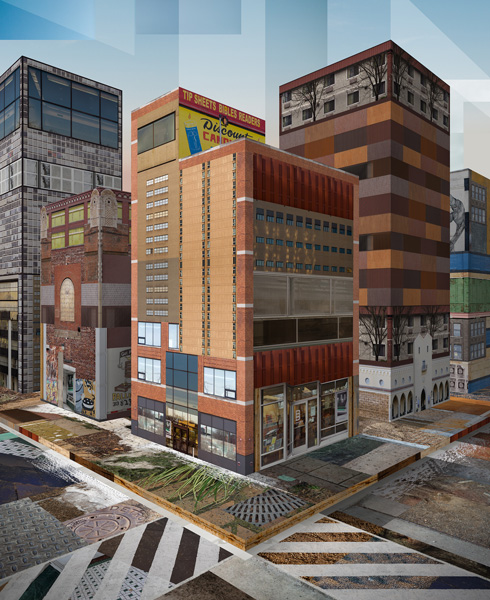 Superblock mines the literal and metaphorical connections between virtual and physical windows, and continues Hamilton’s fascination with the screen as a site that merges transmission, reception and production. Here, Hamilton has crowd-sourced images of and around the six physical sites of the Window | National project, and a selection of these images has then been intricately collaged to create a single complex and layered image. The sites have been combined and collapsed into each other via the surface of the screen to create an image which will then be physically transferred back onto the physical sites and surfaces of the six windows hosting the project. The screen here is site of both orientation and displacement: places can be accessed remotely, and exactly defined, spatially and geographically, via online tools, while this ubiquity of instantaneous access to information simultaneously splinters our connection to the singularity of place, incessantly imbricating us within broader networks of communication where, as Paul Virilio notes, “here and there no longer mean anything […] the difference between ‘near’ and ‘far’ simply ceases to exist” (“The Overexposed City” 1984).