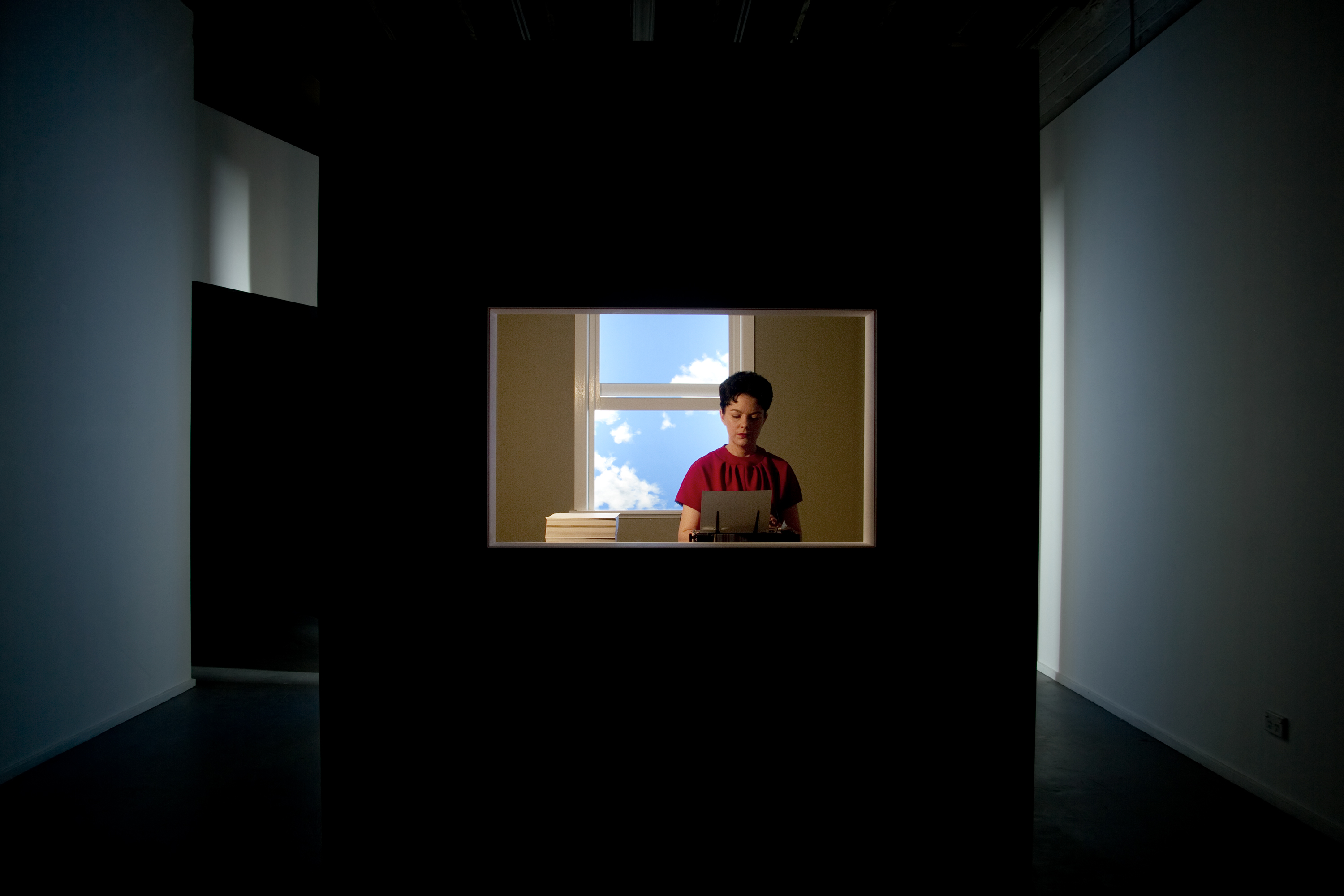 The work continues Hine’s interest in exploring procedures of mediation through the juxtaposition of video and performance elements within gallery installations.