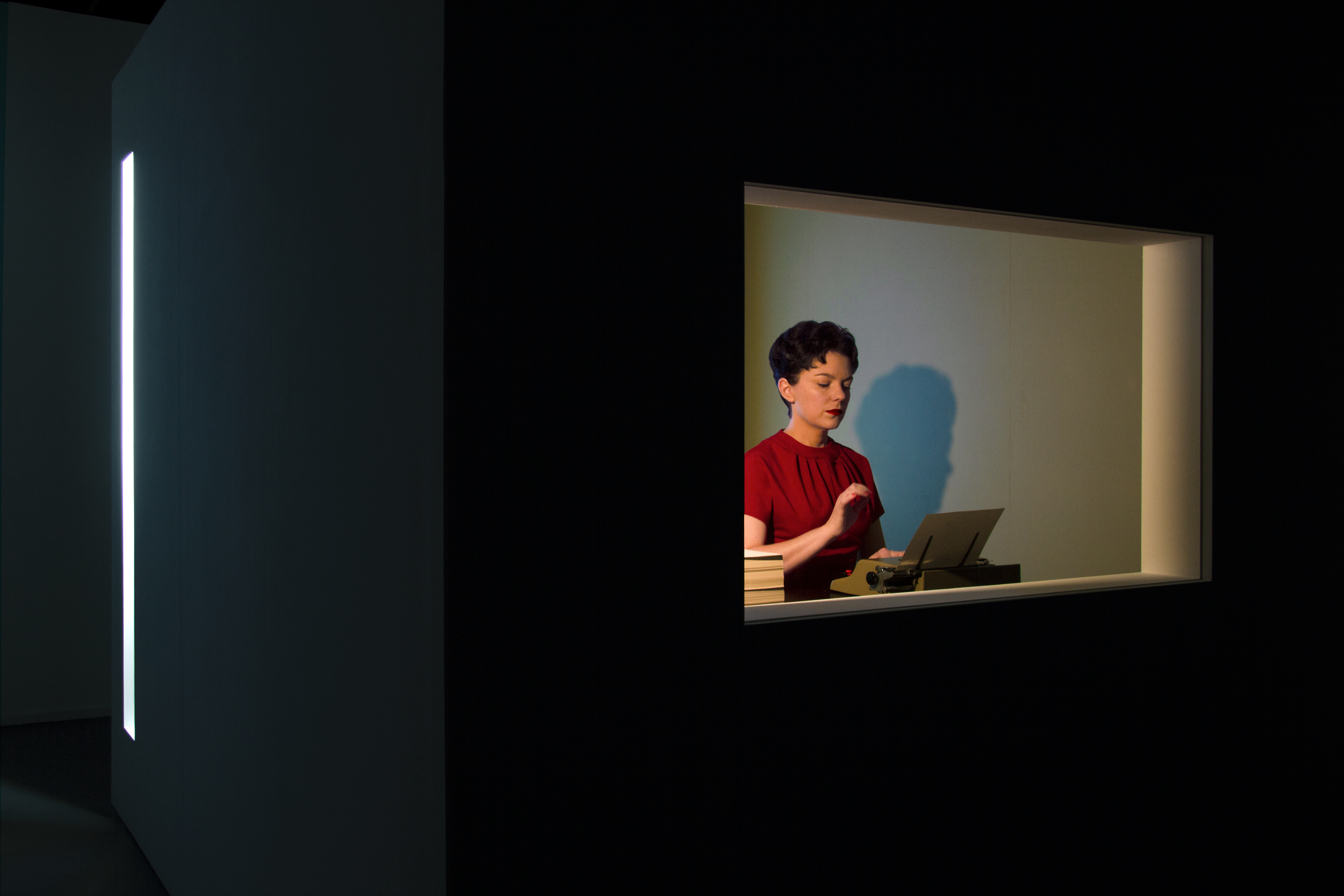 Running for two-days only, the work incorporated a performance element for the two-day duration of the exhibition. Set in a 1950s office, the work focuses on a simple gesture that is repeated. Mediated through video, the gesture repeats infinitely, but when performed live this same gesture is approximated through repetition.