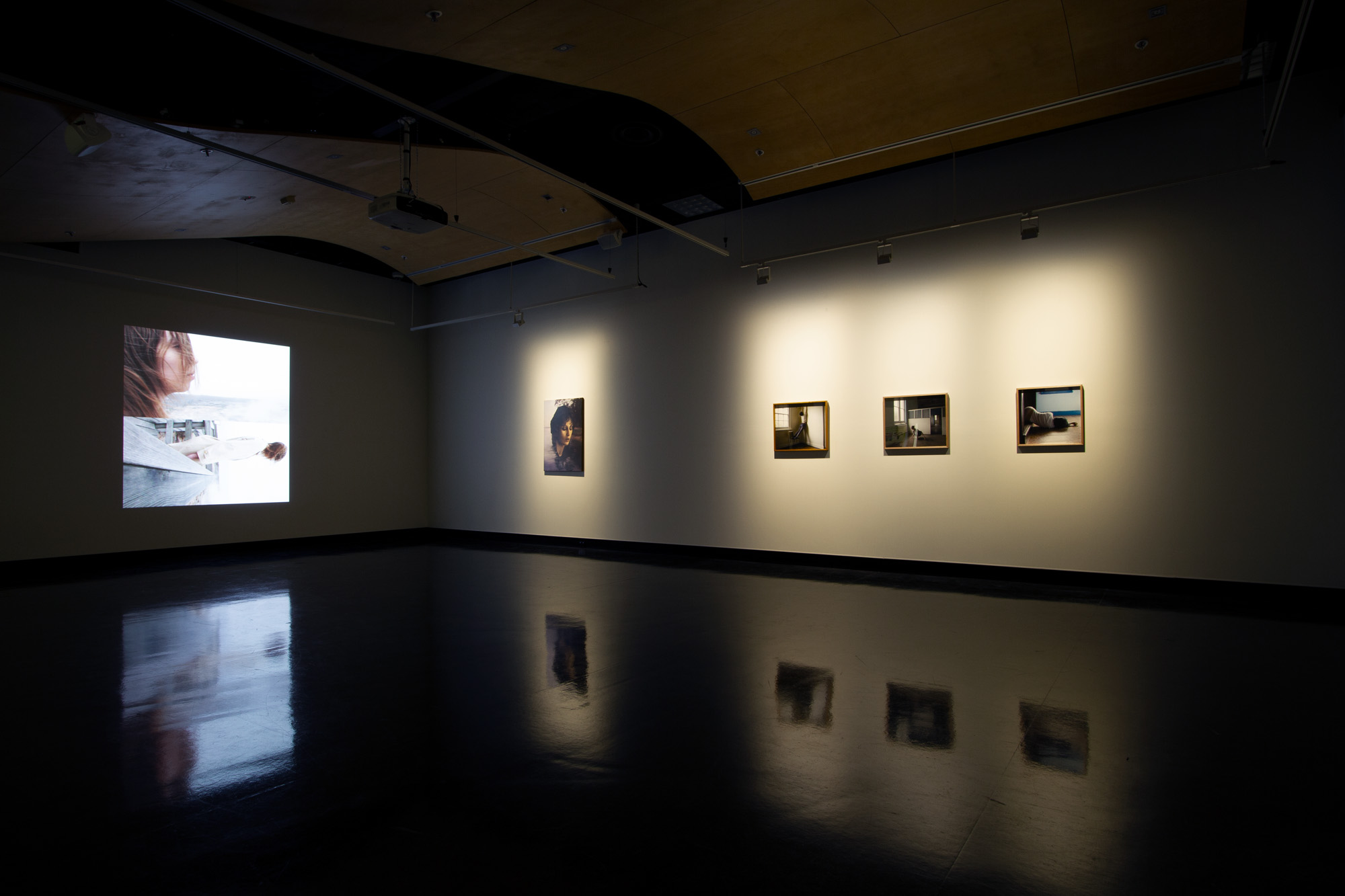 Heidi Yardley, Severence, 2013. Oil on Linen, 97x71cm; Clare Rae, Untitled #6, 2010. Archival Pigment Print, 50x60cm; Untitled #2, 2013. Archival Pigment Print, 50x60cm; Untitled #5, 2007. Archival Pigment Print, 50x50cm. Installation View. With Her Feet Off the Ground, Counihan Gallery, 2015.